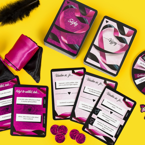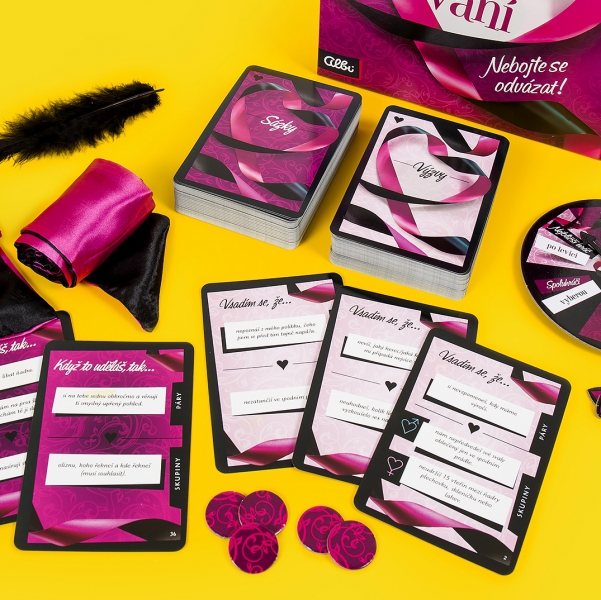 - Balení obsahuje: 70 karet Výzev, 70 karet Sázek, 30 karet Peprných výzev, 30 karet Peprných sázek, 40 žetonů bodů ve tvaru srdce, 12 oboustranných hráčských žetonů, Roztoč-to-vač, peříčko, 2 přehledové karty, 2 šátky na spoutávání či zakrývání očí, pravidla v českém a slovenském jazyce