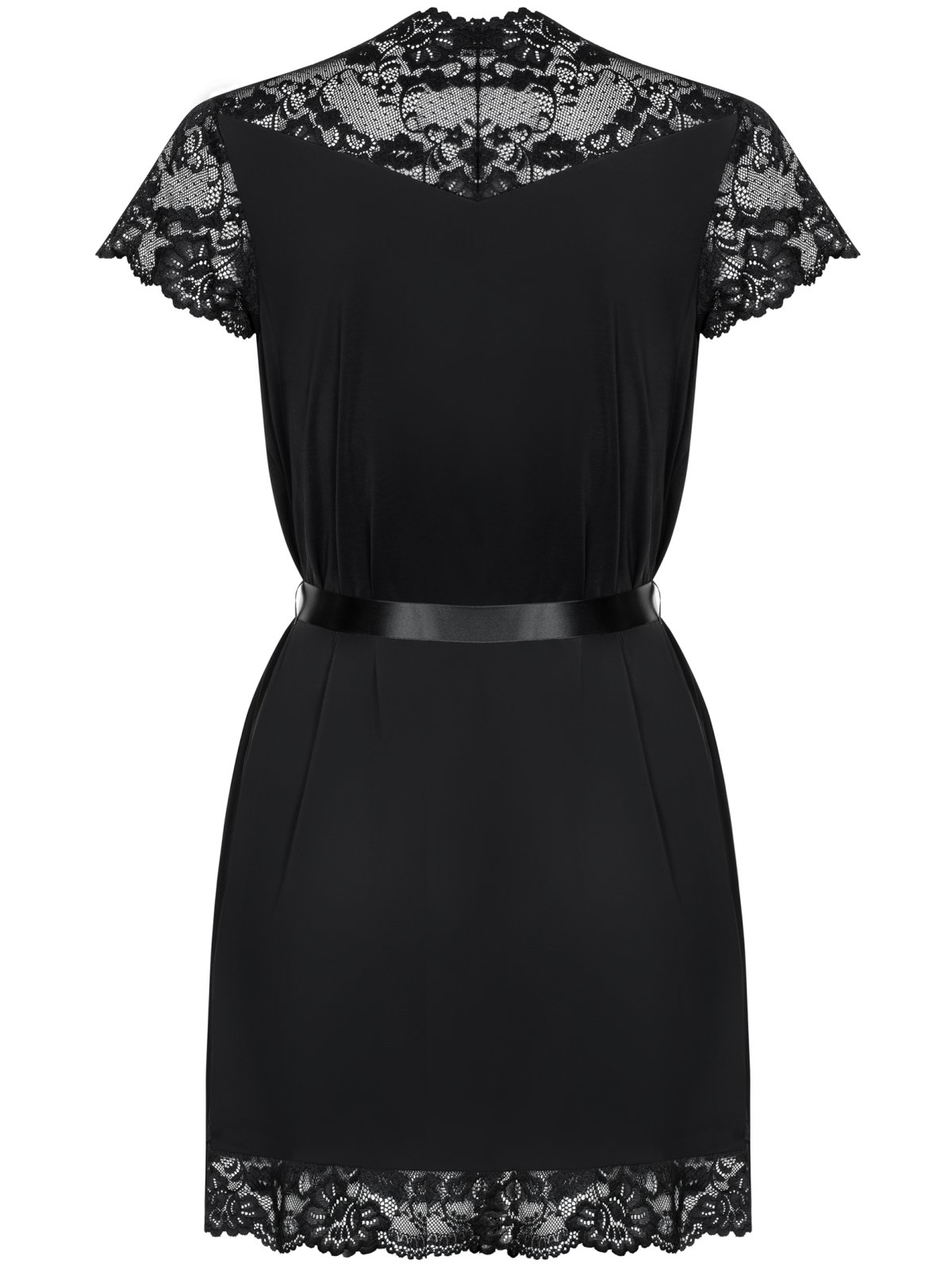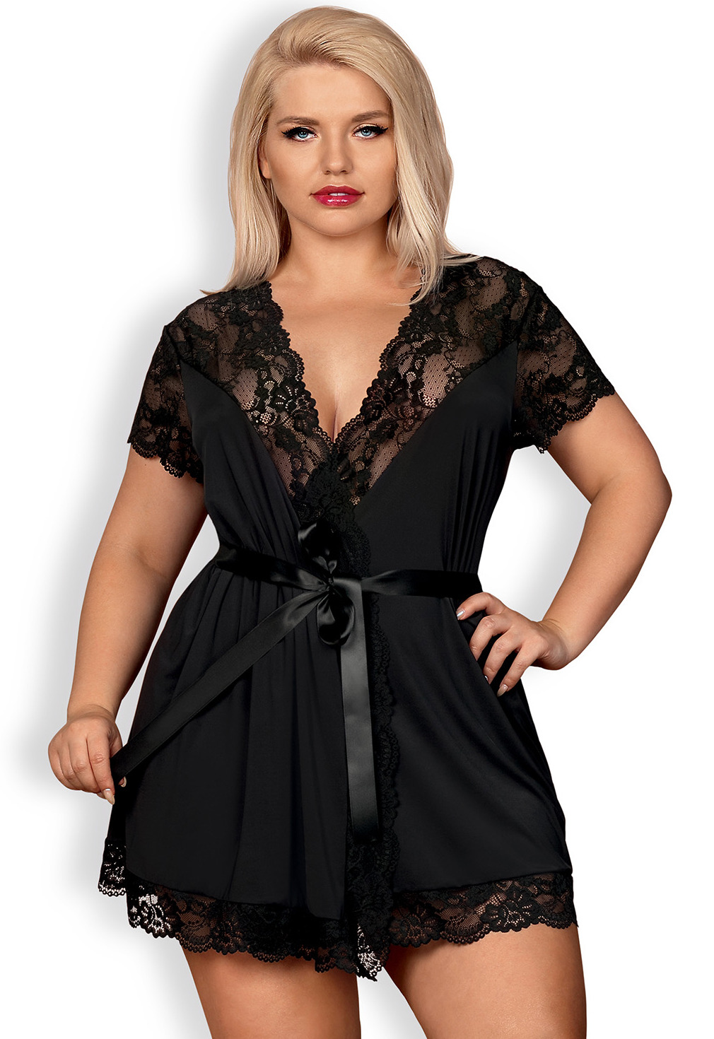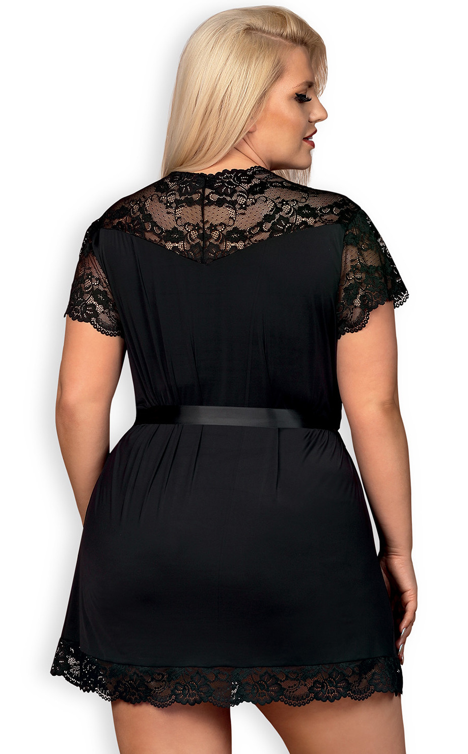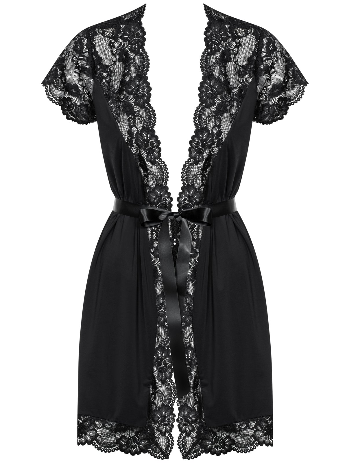 Župánek od Obsessive je ušitý z na dotek jemné a elastické látky, přičemž krátké rukávy a lemy jsou z průsvitné krajky s květinovým vzorem.