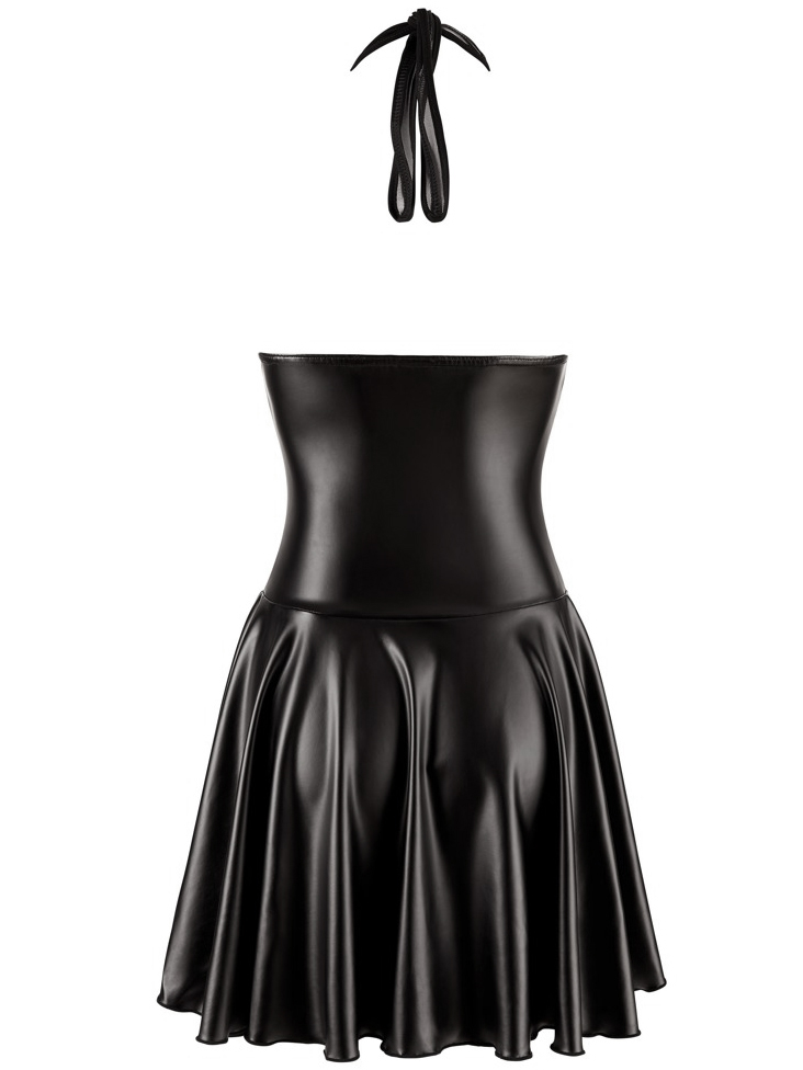 Minišaty mají zavazování za krk a skládaná sukně je vzadu mírně delší. Partnera nerozdráždí jen lehký náznak vašeho zadečku, který se rýsuje v lesklé sukýnce, ale hlavně průsvitná vrchní část šatů, díky které dopřejete partnerovi i výhled na vaše ňadra.
