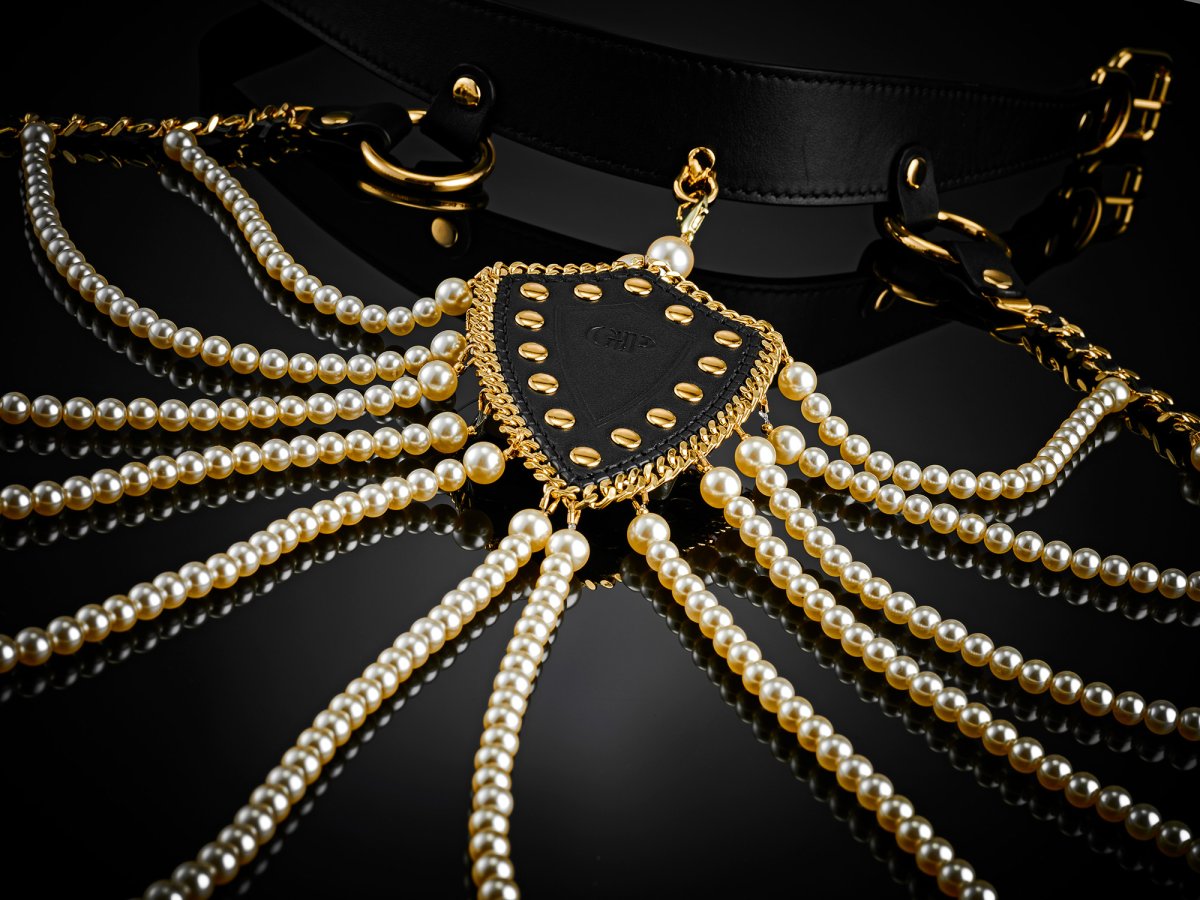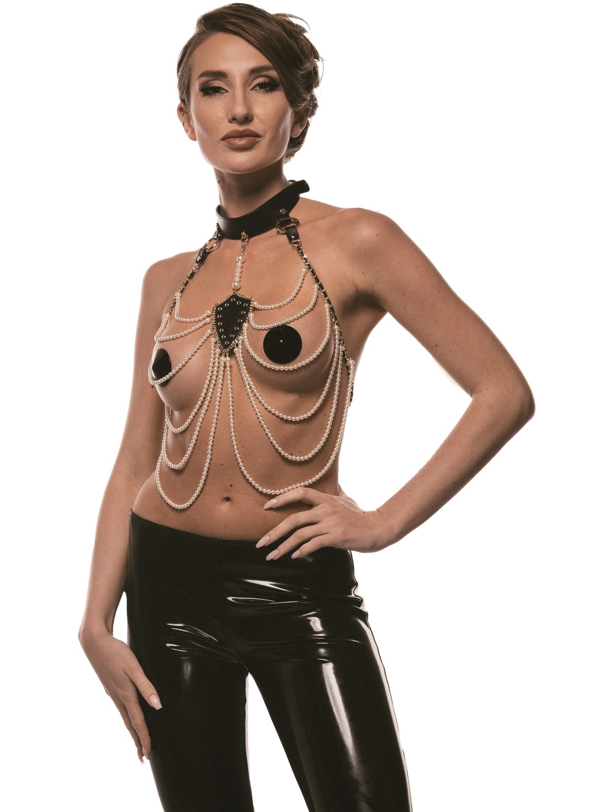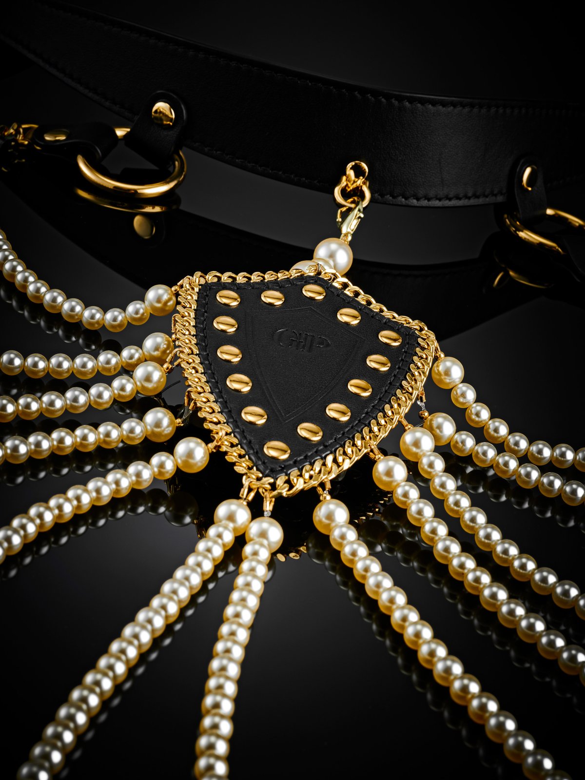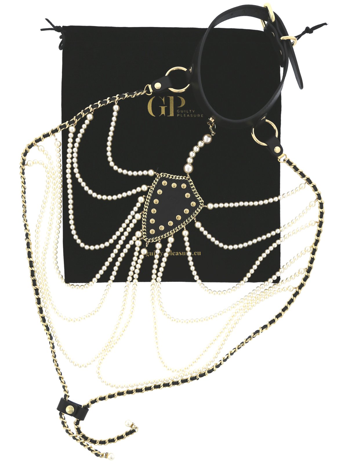 Obojek má perlové řetízky a zlaté kování a detaily – poslouží jako odvážná ozdoba nahého těla či jako doplněk k erotickému prádlu nebo módnímu outfitu.