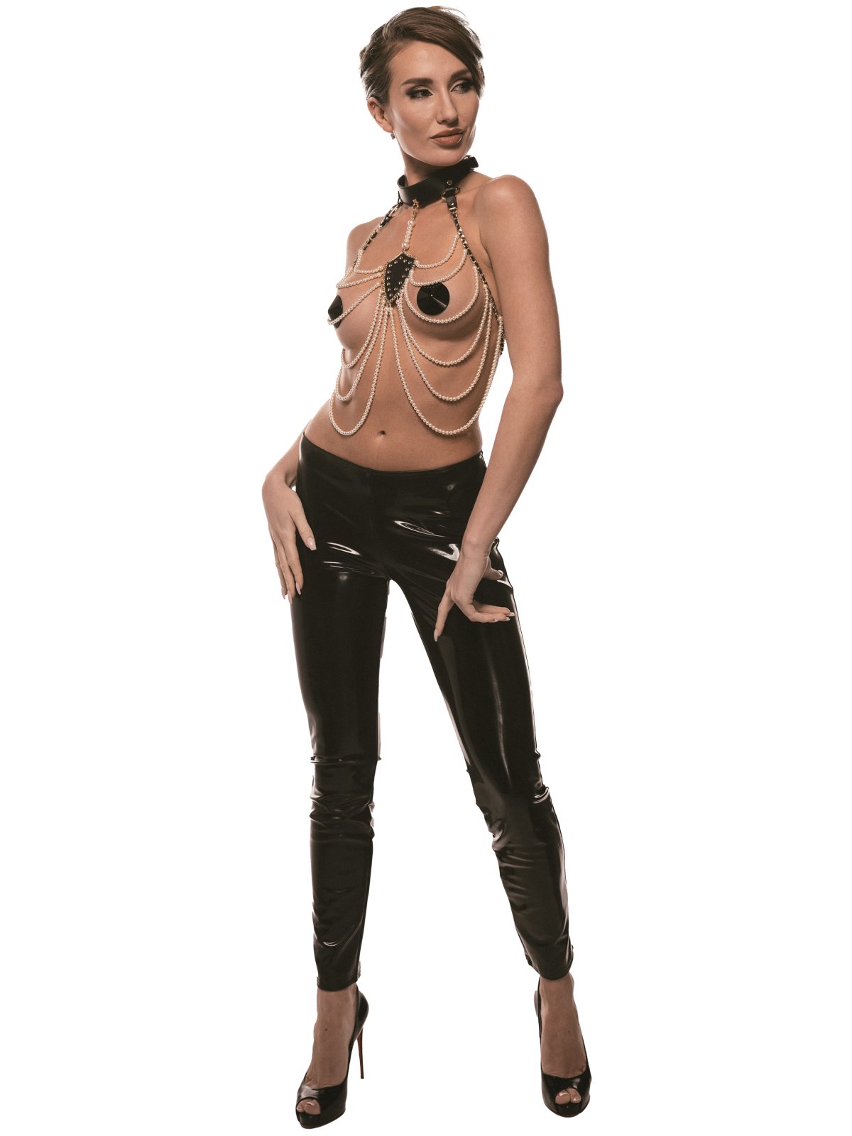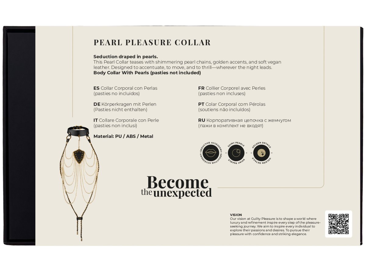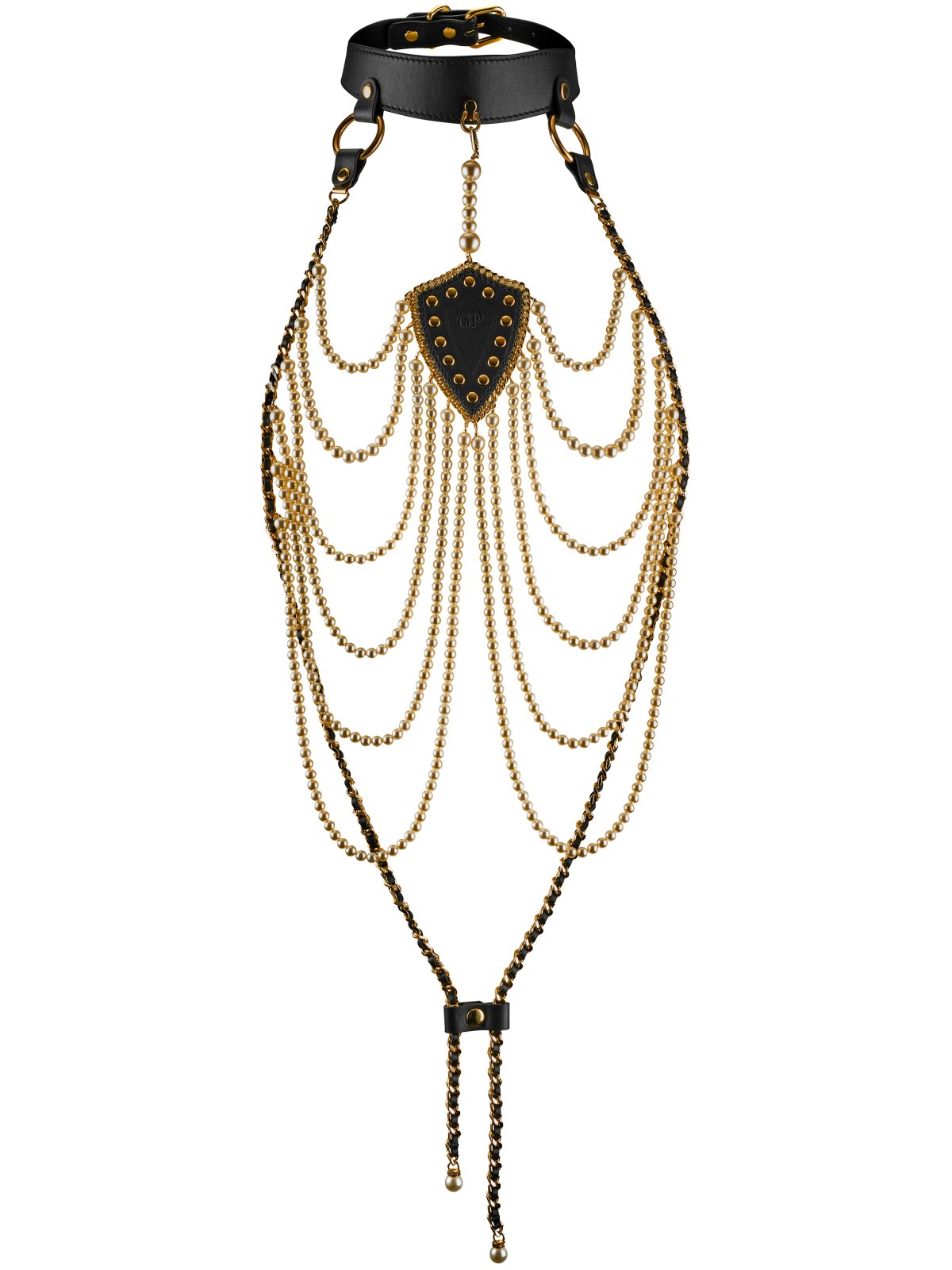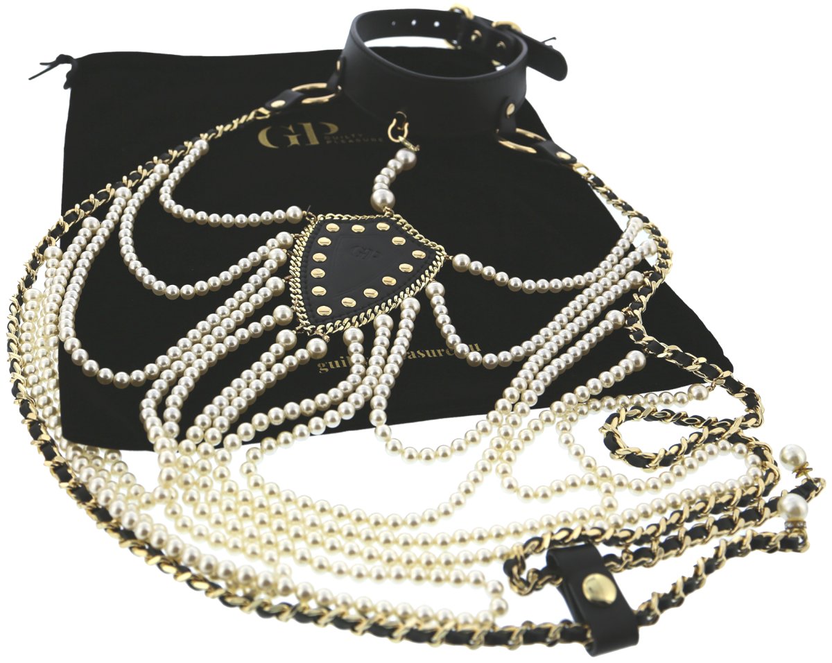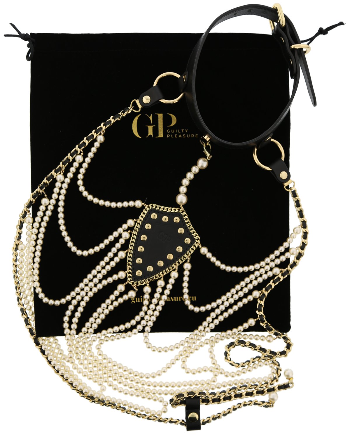 Obojek má perlové řetízky a zlaté kování a detaily – poslouží jako odvážná ozdoba nahého těla či jako doplněk k erotickému prádlu nebo módnímu outfitu.