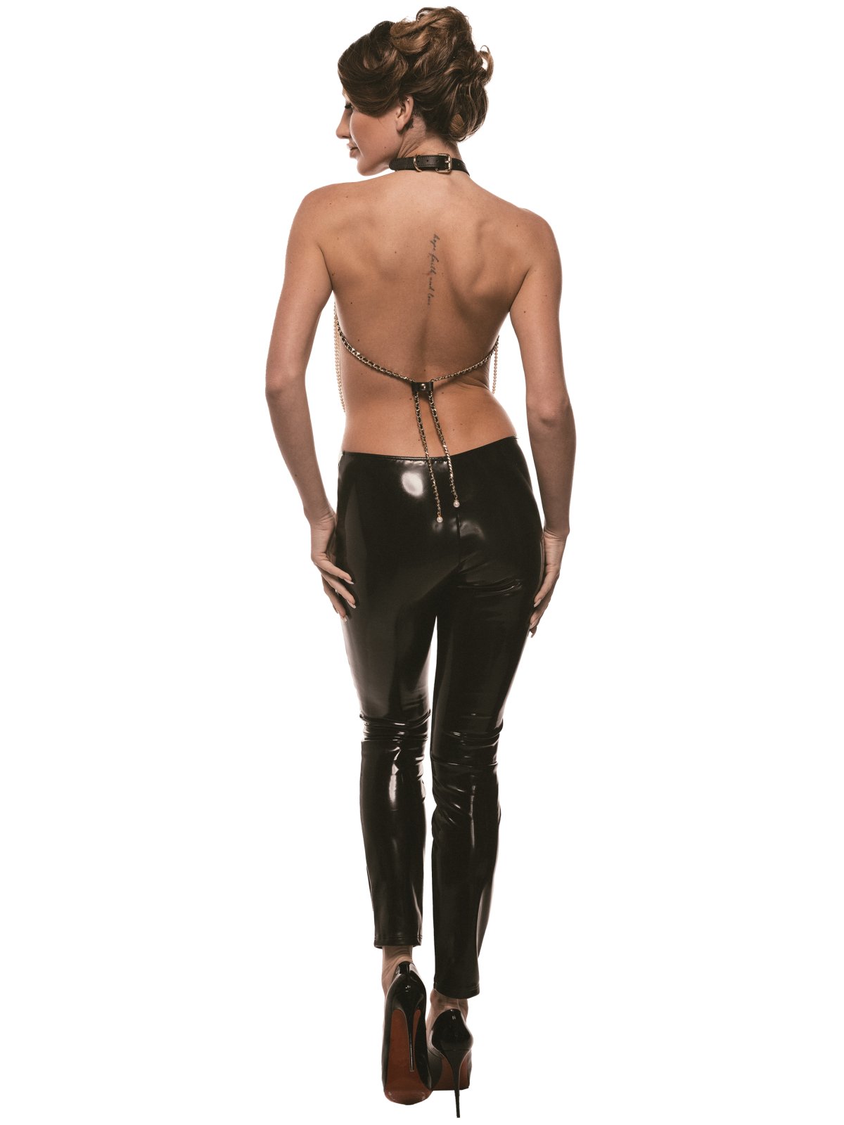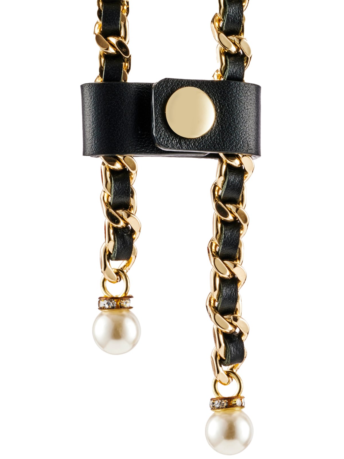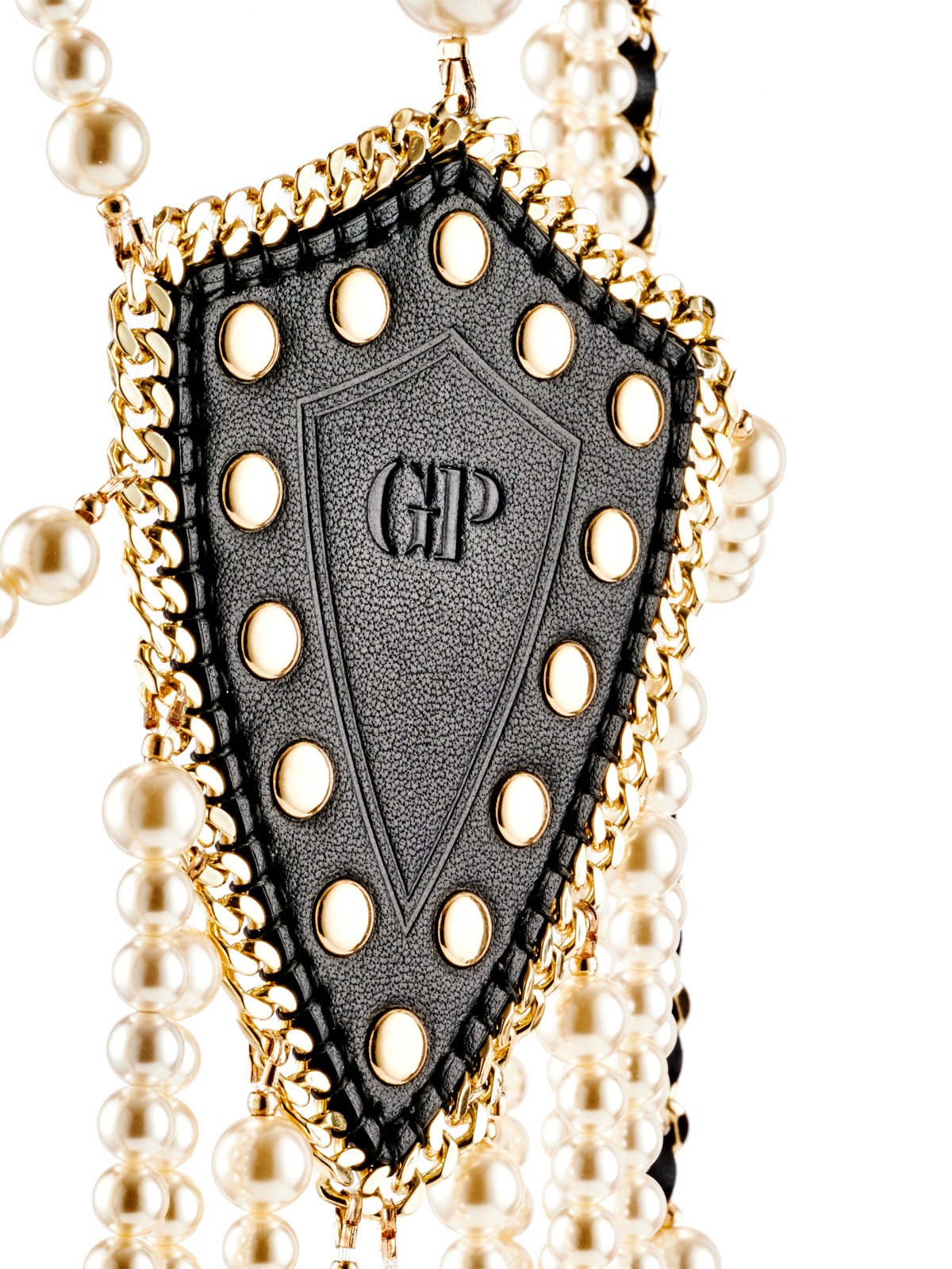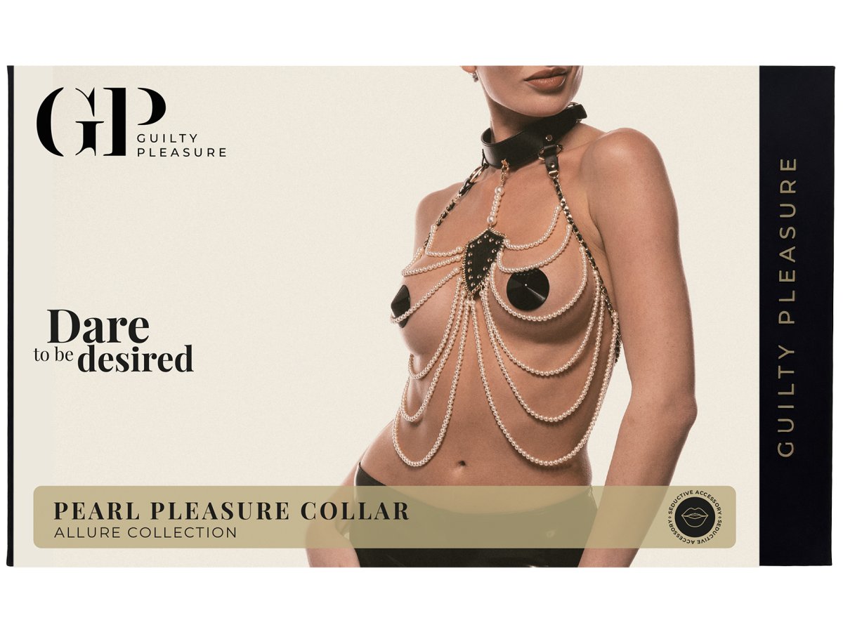Obojek má perlové řetízky a zlaté kování a detaily – poslouží jako odvážná ozdoba nahého těla či jako doplněk k erotickému prádlu nebo módnímu outfitu.