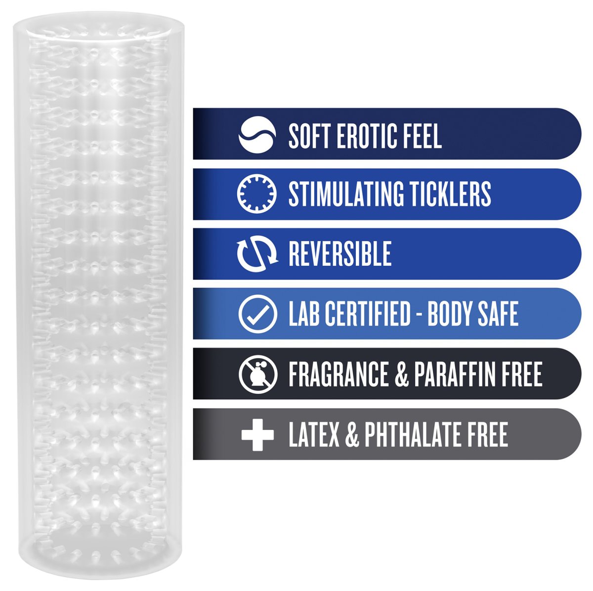 Je průhledný, takže můžete během masturbace sledovat svůj penis, a vyrobený z měkkého a elastického TPE – přizpůsobí se téměř jakékoliv velikosti penisu, ale zároveň vám dopřeje příjemně pevné sevření.