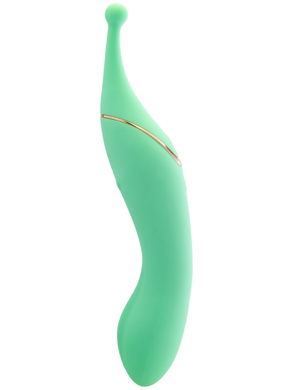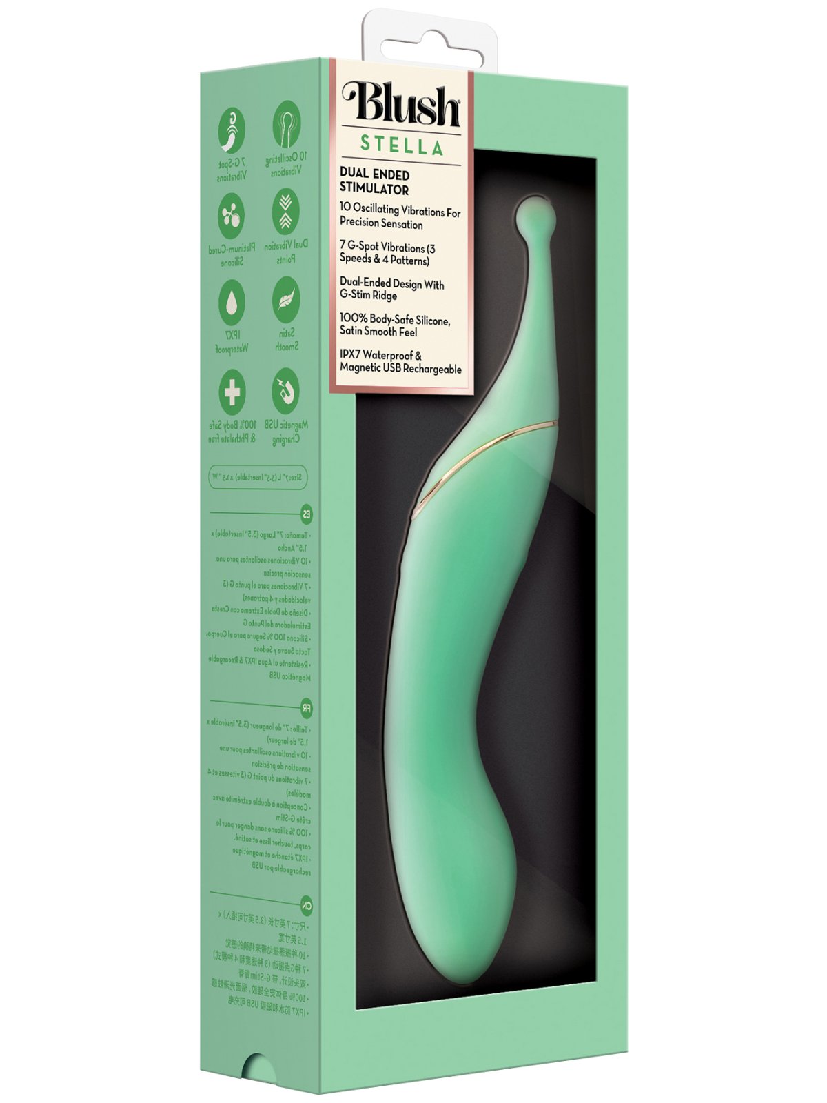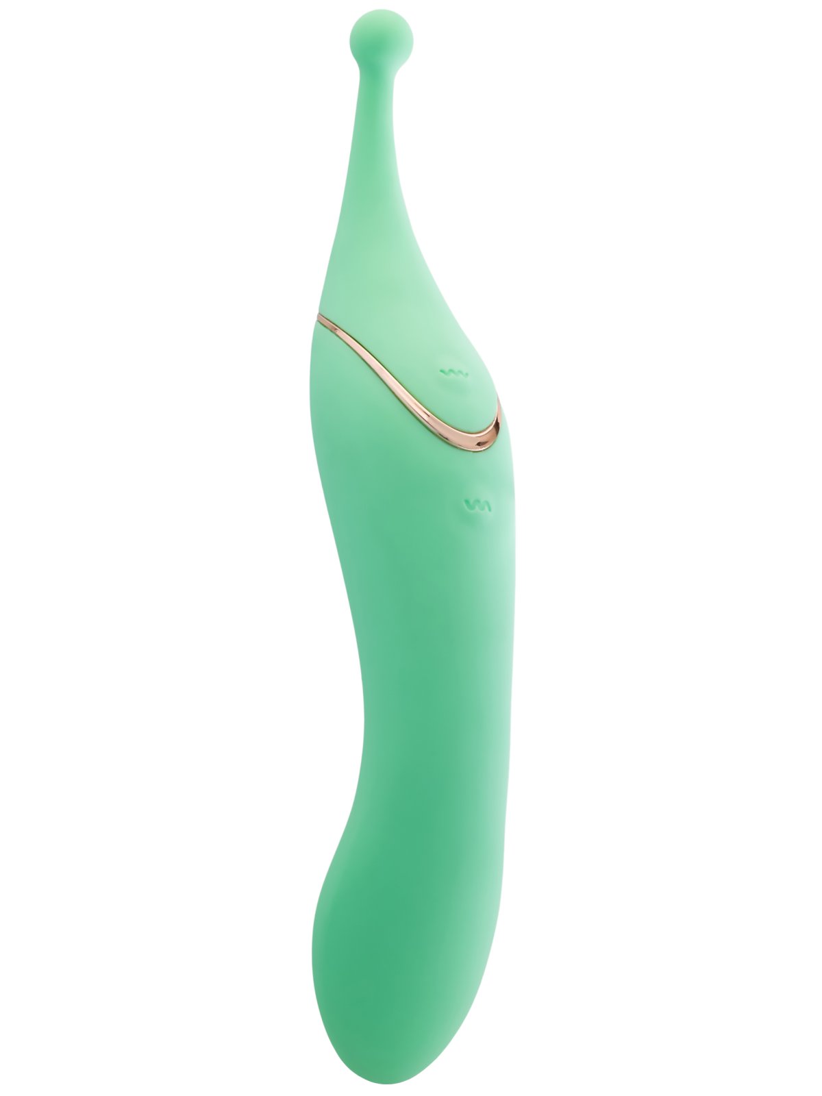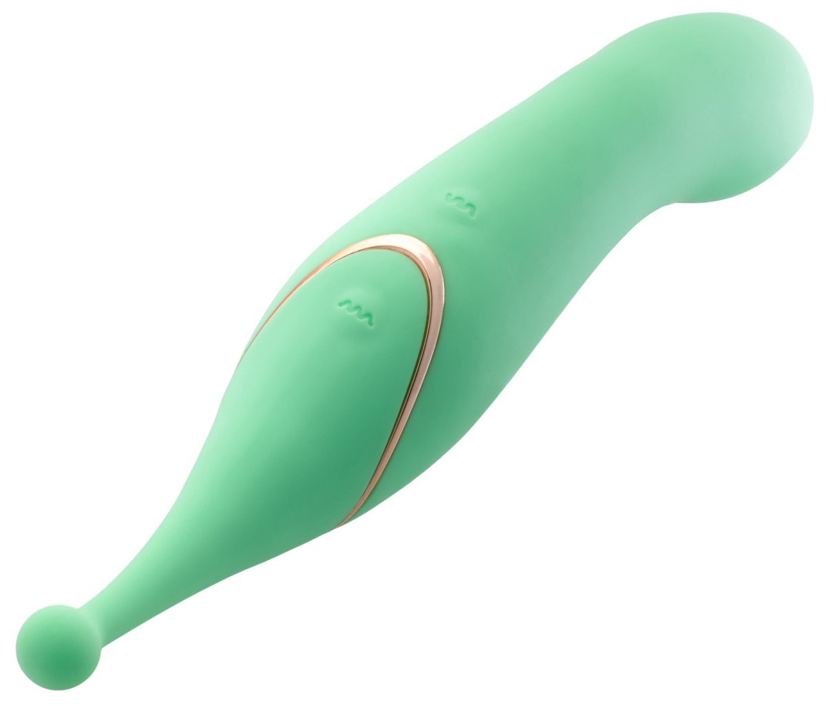 Vibrátor Stella je oboustranný – jedna strana slouží pro masáž bodu G, druhá pro přesné zacílení oscilačních vibrací, třeba na klitoris nebo bradavky.