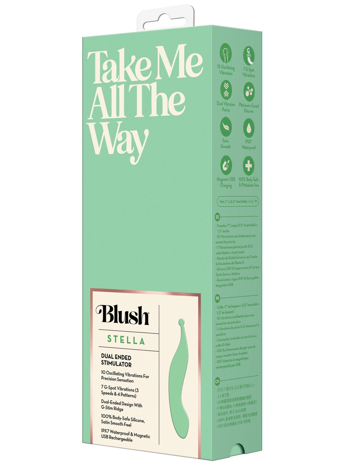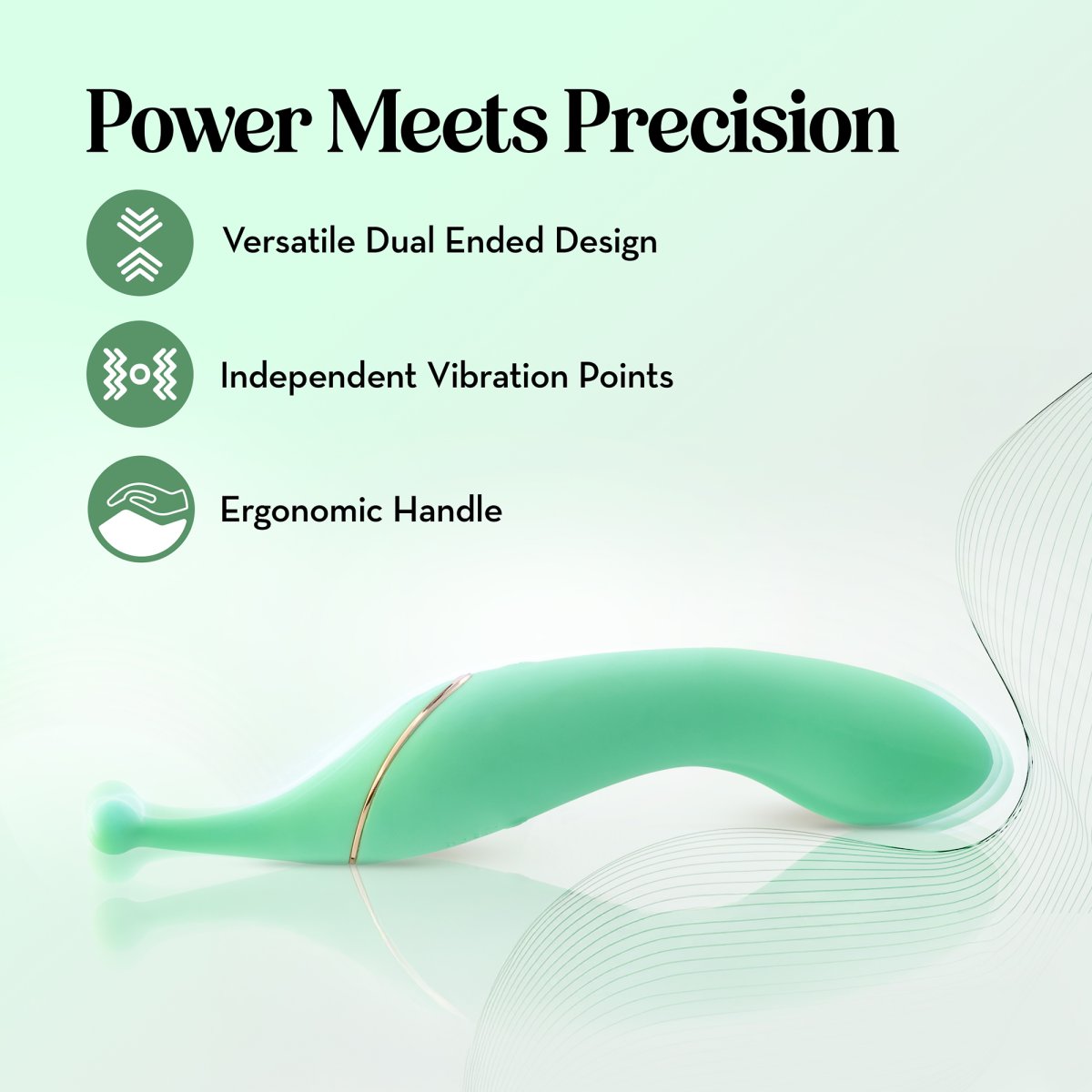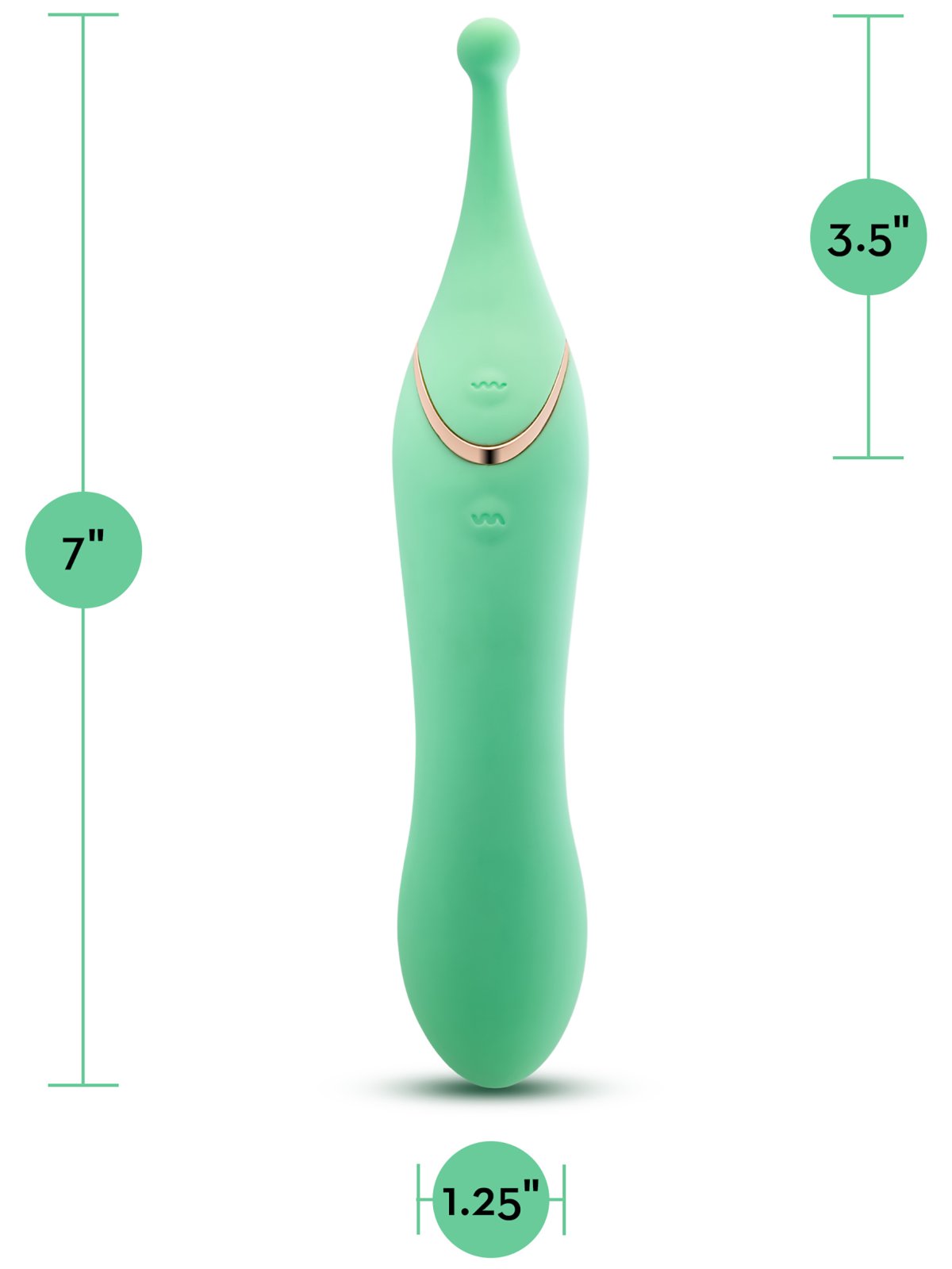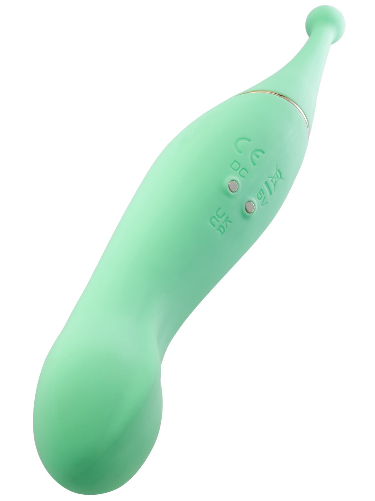 Vibrátor Stella je oboustranný – jedna strana slouží pro masáž bodu G, druhá pro přesné zacílení oscilačních vibrací, třeba na klitoris nebo bradavky.