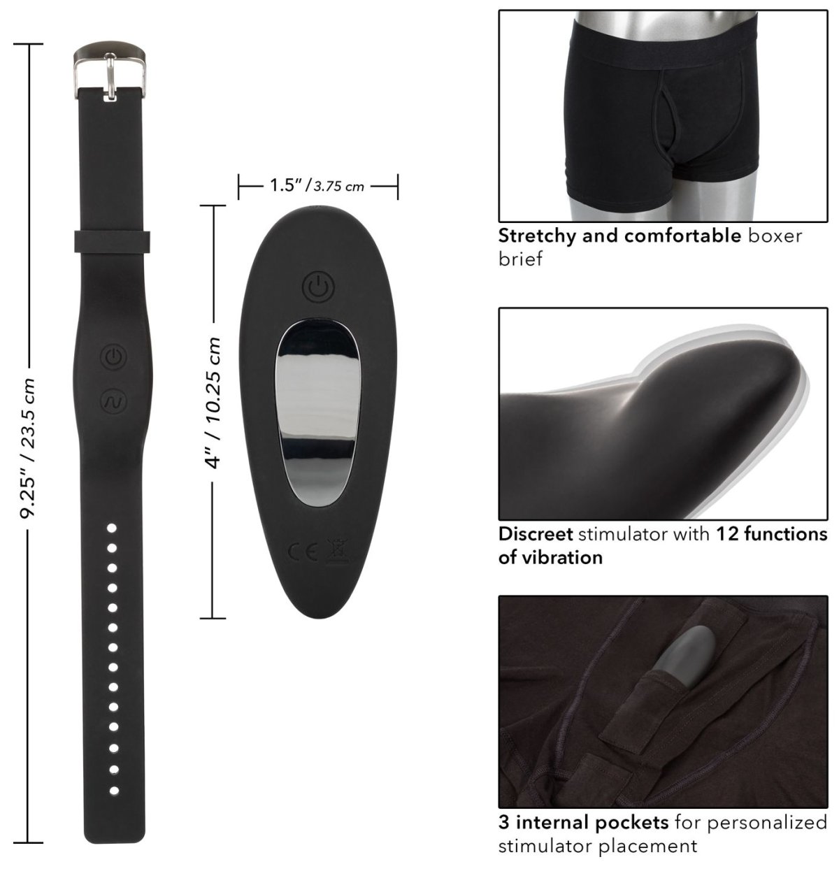 Boxerky ukrývají vibrátor pro stimulaci penisu během nošení. Díky diskrétnímu dálkovému ovladači v podobě hodinek se přímo nabízejí hrátky v páru doma i venku.