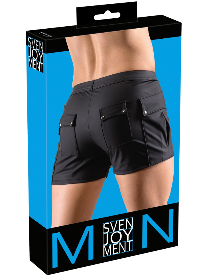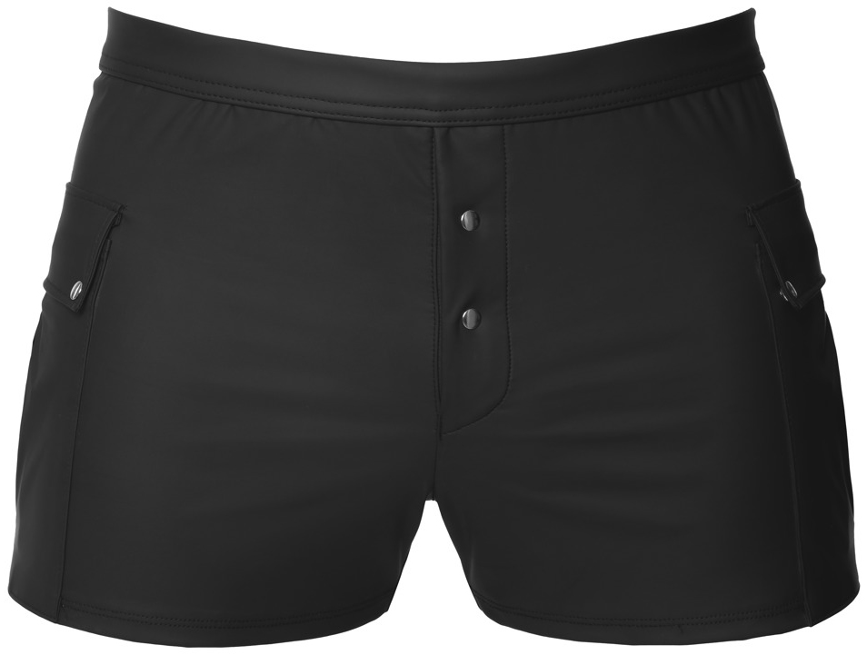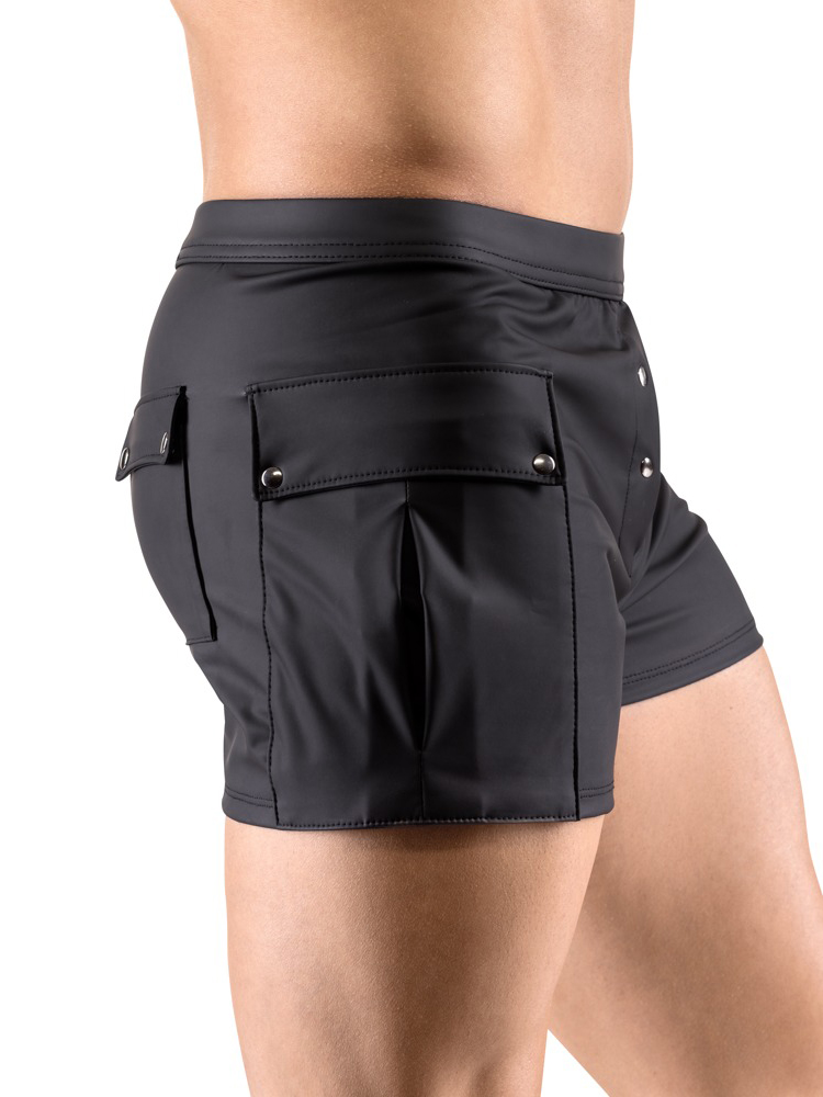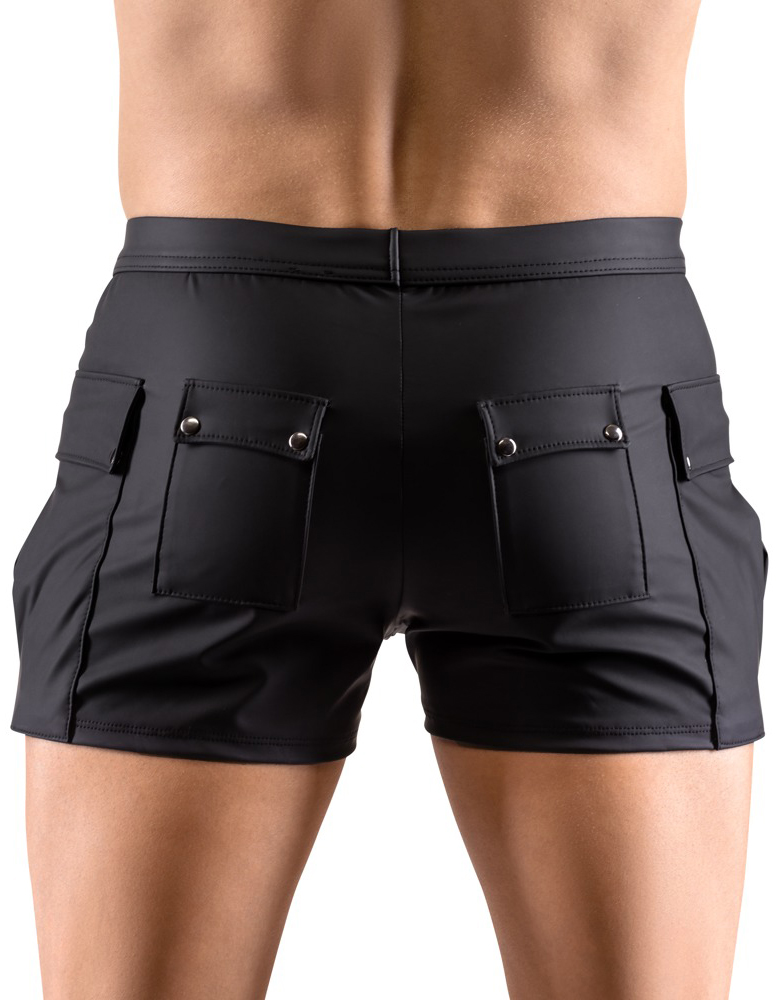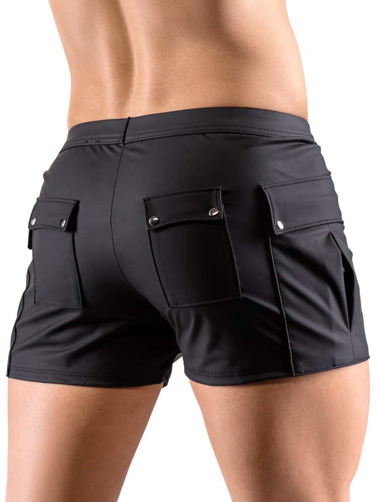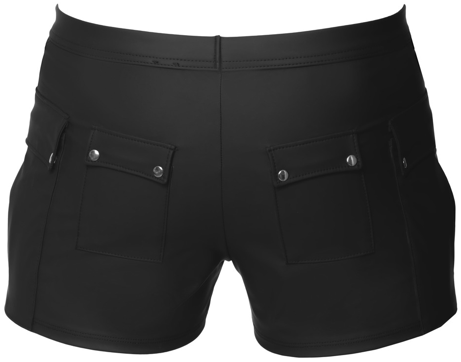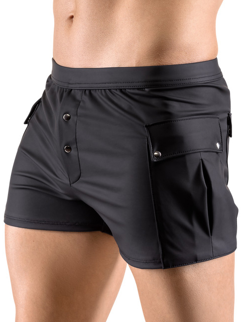 Šortky jsou ušity z měkké a elastické wetlook látky s matně lesklým povrchem. Mají gumu v pase, poklopec se zapínáním na 2 druky a 4 funkční kapsy.