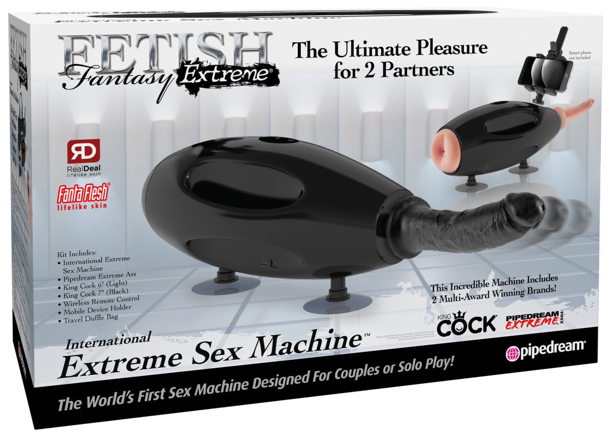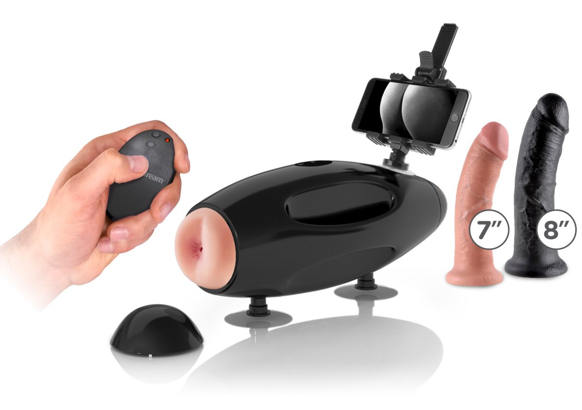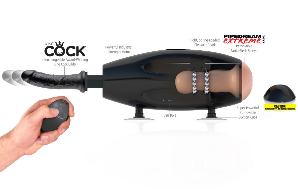 - Obsah balení: šukací stroj, King Cock 7", King Cock 8", umělý zadeček, dálkový ovladač, držák na mobil, univerzální cestovní adaptér, cestovní taška