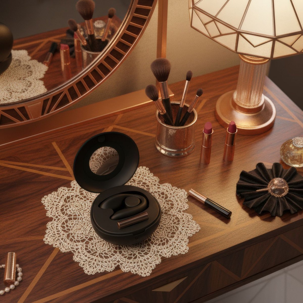 K vibrátoru dostanete praktické pouzdro, které slouží jako dokovací stanice pro vibrátor i ovladač. Pouzdro ochrání vibrátor před prachem i poškozením, a to i během cest. Na vnitřní straně víčka najdete zrcátko.