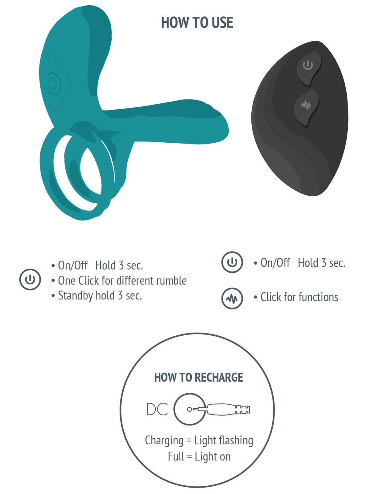 Jak se ovládá? Pro zapnutí/vypnutí vibrátoru do stand-by módu podržte tlačítko po dobu 3 sekund, krátkými stisky přepínáte mezi vibračními programy. Dálkový ovladač zapnete/vypnete podržením tlačítka se symbolem vypínače po dobu 3 sekund, mezi vibračními programy přepínáte druhým tlačítkem.