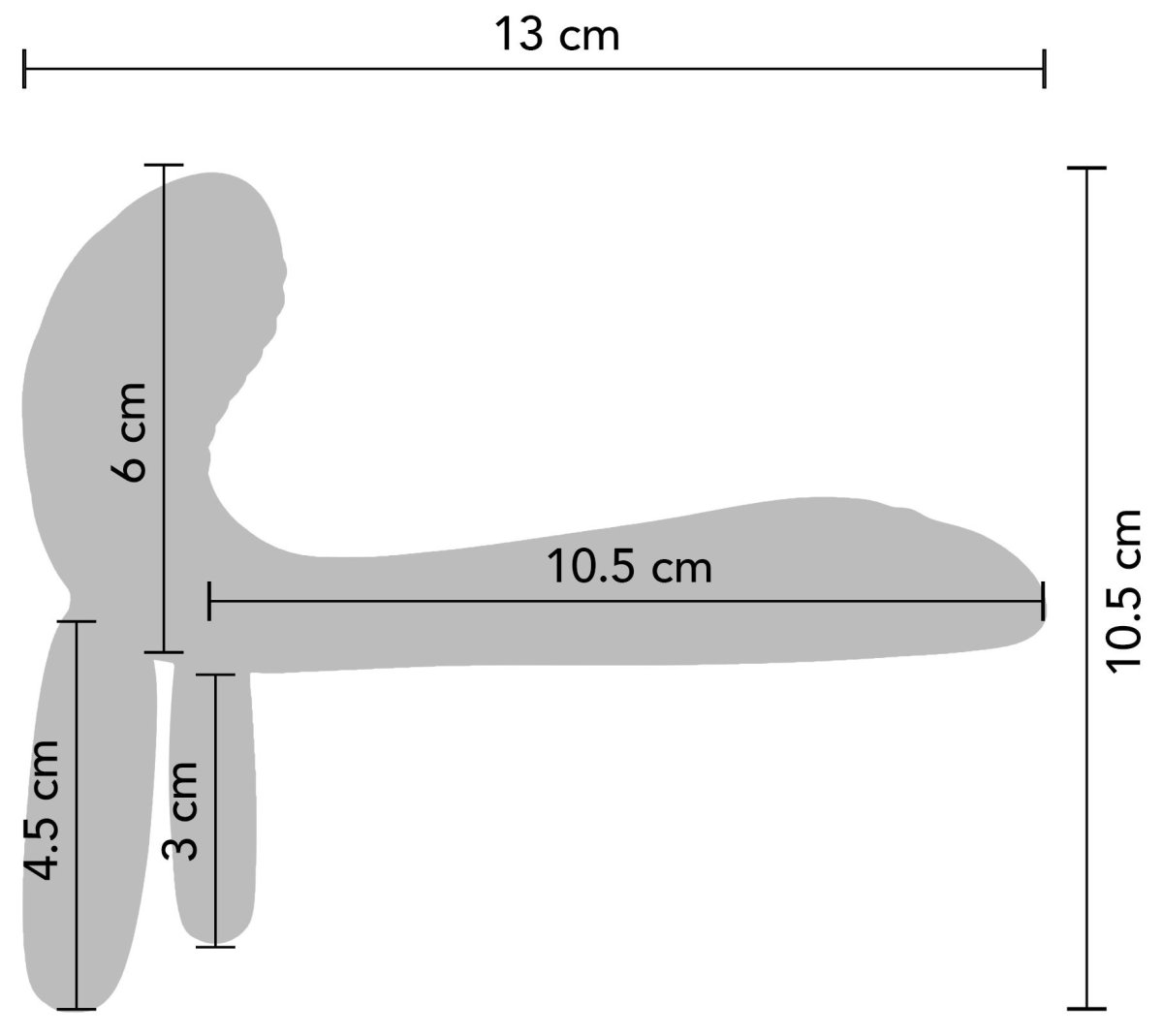 - Rozměry: celková délka 13 cm, zasunutelná délka 10,5 cm, max. průměr 2,9 cm, délka výstupku na klitoris 4,5 cm, vnitřní průměr kroužků 3 a 4 cm (velmi elastické)
