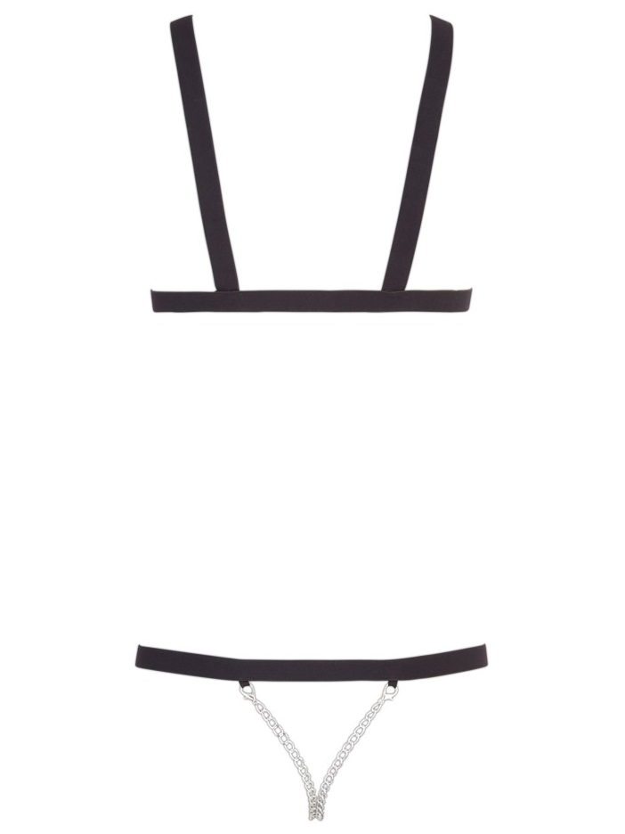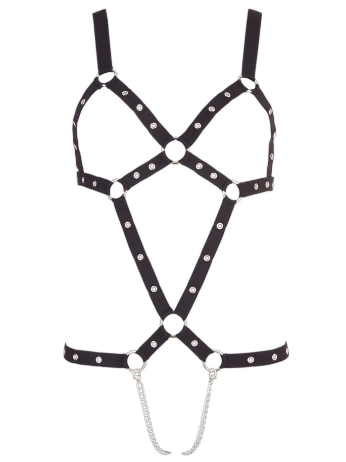 Body tvoří pouze několik elastických textilních popruhů, které jsou mezi sebou pevně spojeny pomocí kroužků. V rozkroku jsou 2 stimulační řetízky.