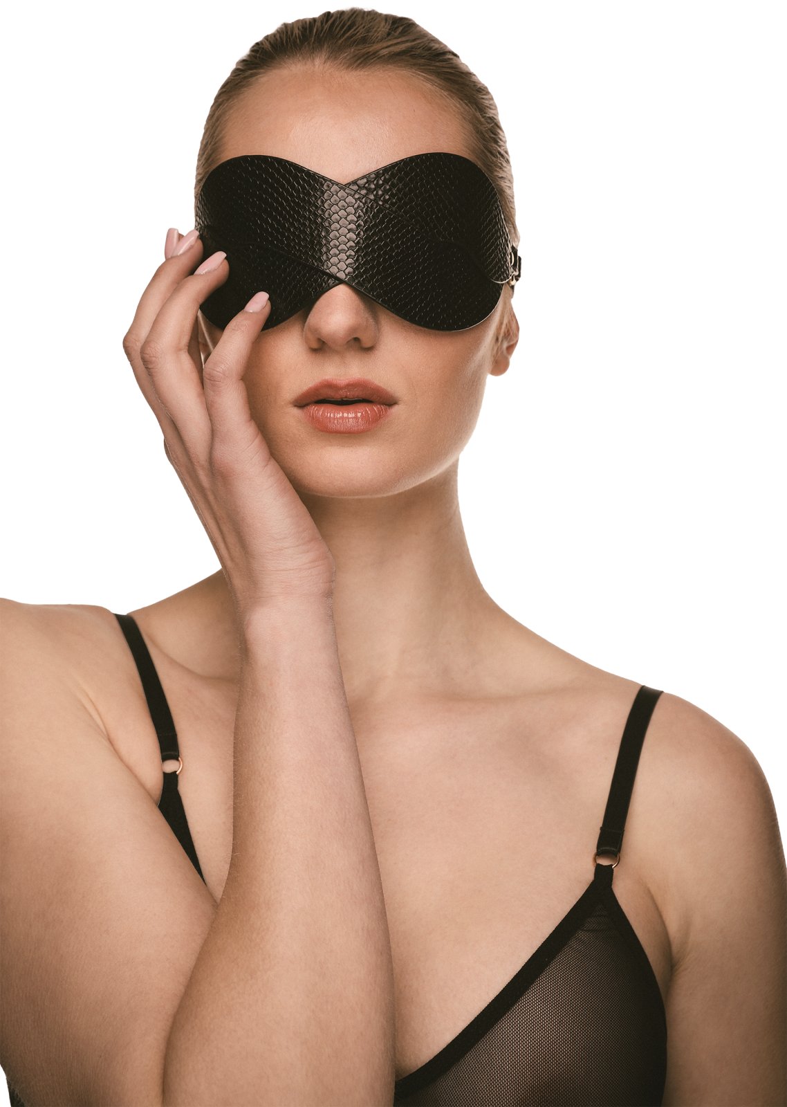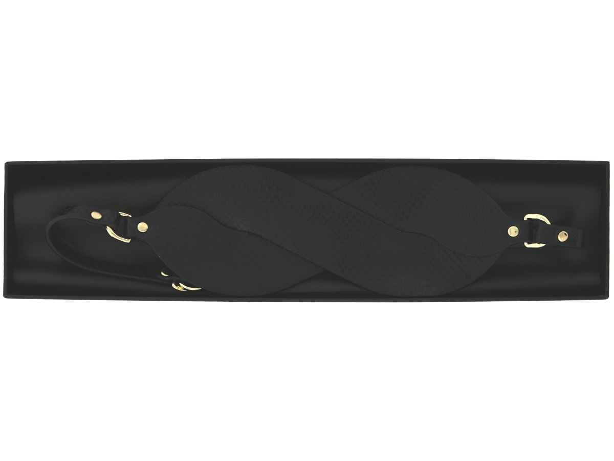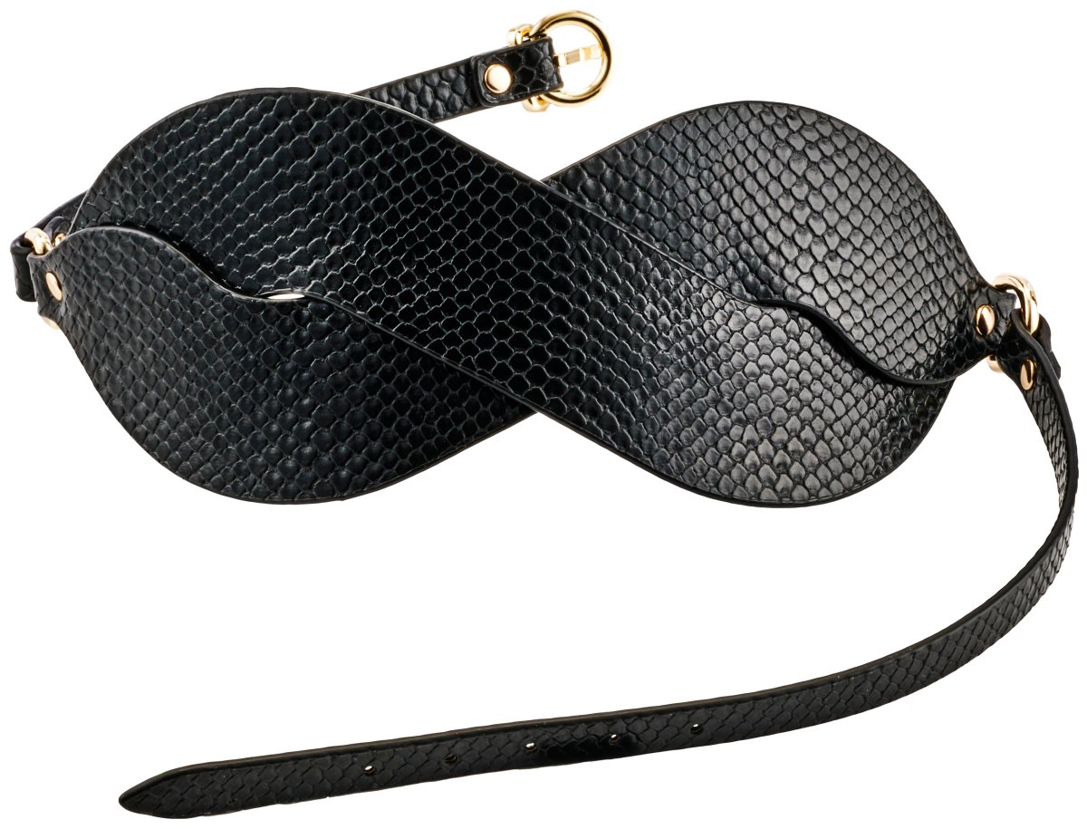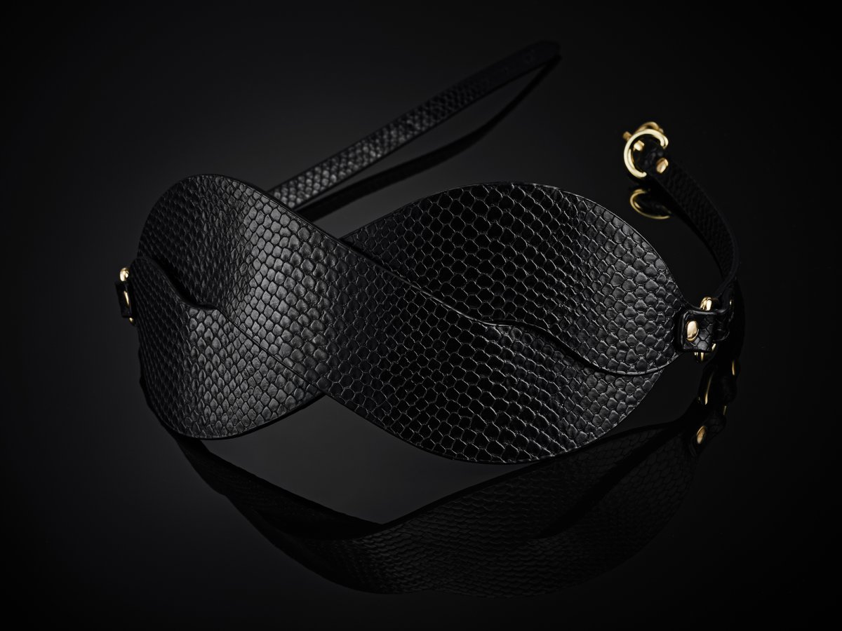 Maska má pletený texturovaný design a zlaté detaily – poslouží jako elegantní pomůcka pro něžné a stylové BDSM dovádění a hru se smysly.