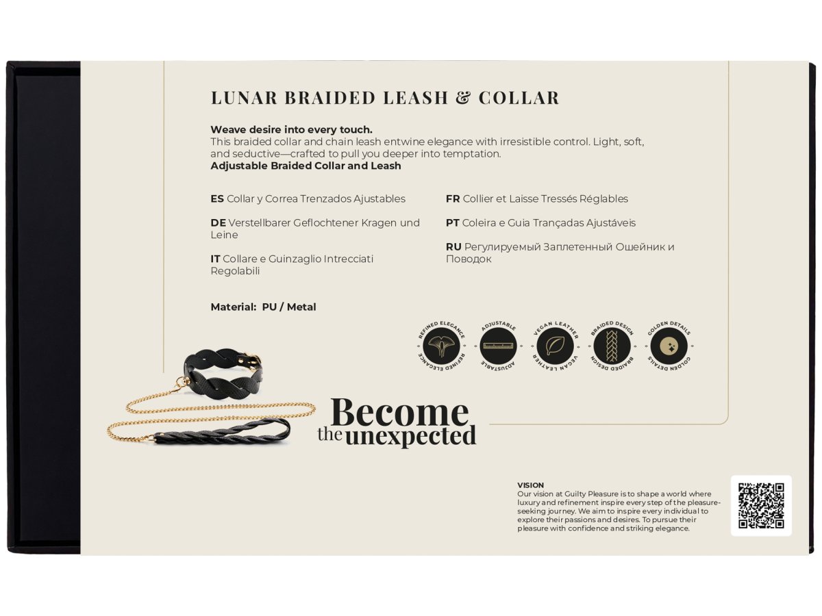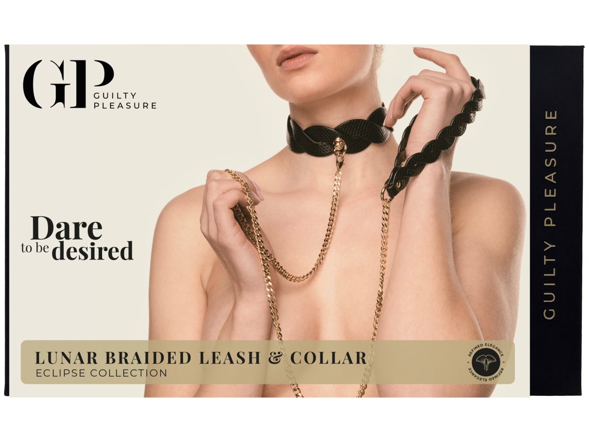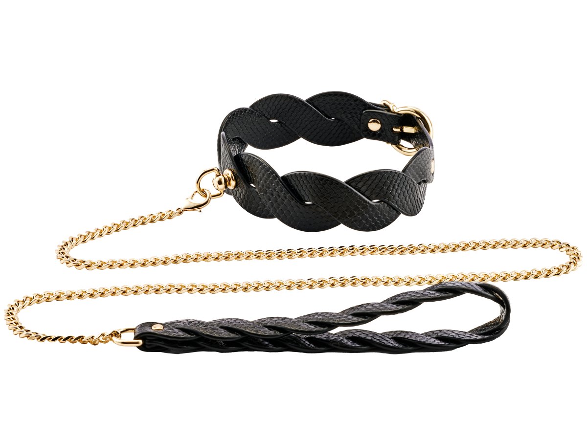 Obojek má pletený texturovaný design a zlaté detaily – poslouží jako elegantní pomůcka pro něžné a stylové BDSM hry.