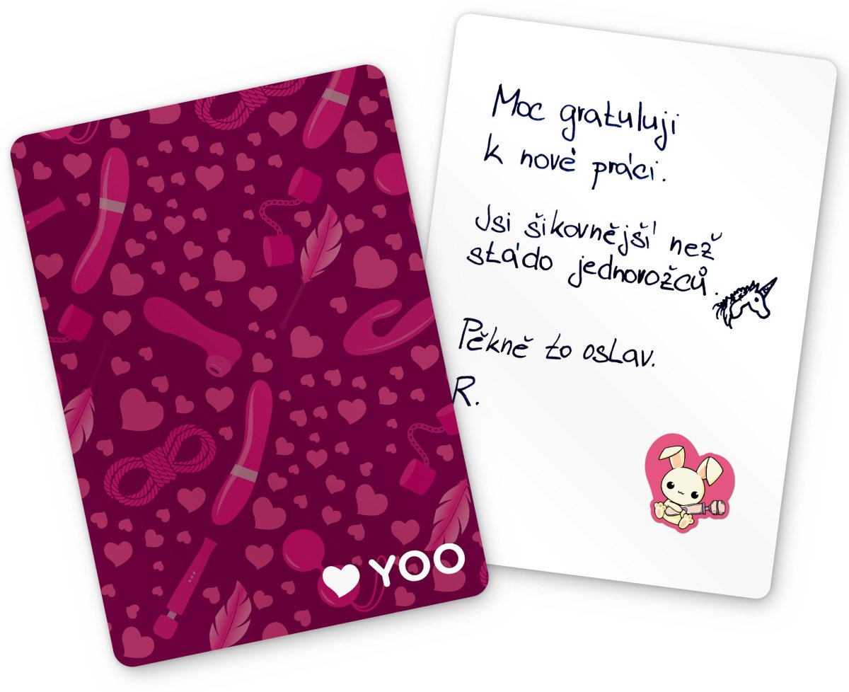 Chcete svému miláčkovi udělat radost a zlepšit mu den? Darujte mu erotickou hračku a přiložte k ní přání YOO s originálním motivem erotických hraček a srdíček.