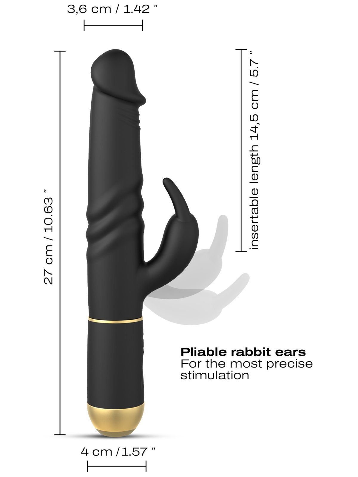 - Rozměry: celková délka 27 cm, zasunutelná délka 14,5 cm, max. průměr 3,6 cm, délka králíčka cca 5,5 cm