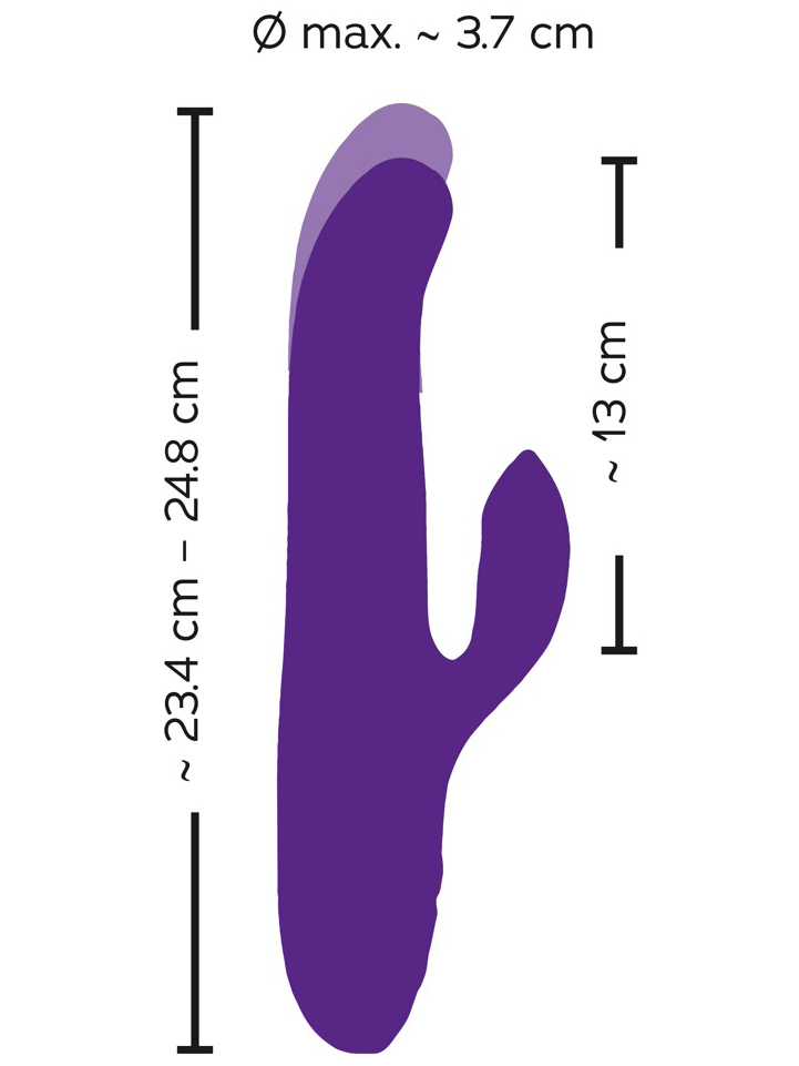 - Rozměry: celková délka 23,4 cm, zasunutelná délka 13 cm, max. průměr 3,7 cm, délka králíčka cca 5,5 cm