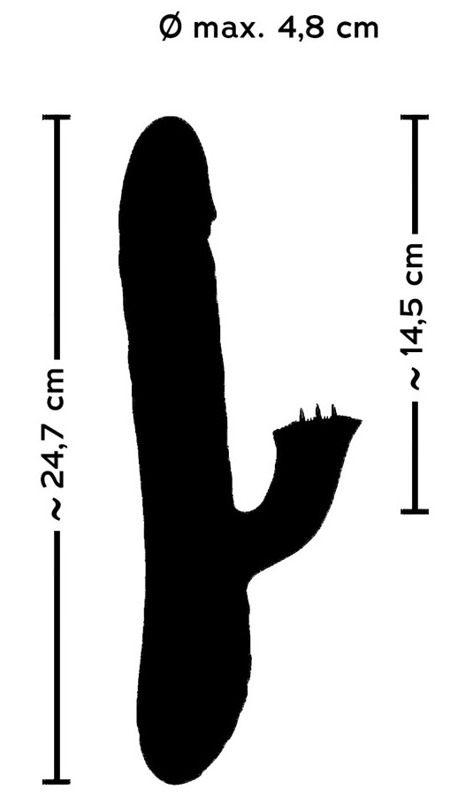 - Rozměry: celková délka 24,7 cm, zasunutelná délka cca 14,5 cm, max. průměr 3,7 cm, délka králíčka cca 5,5 cm