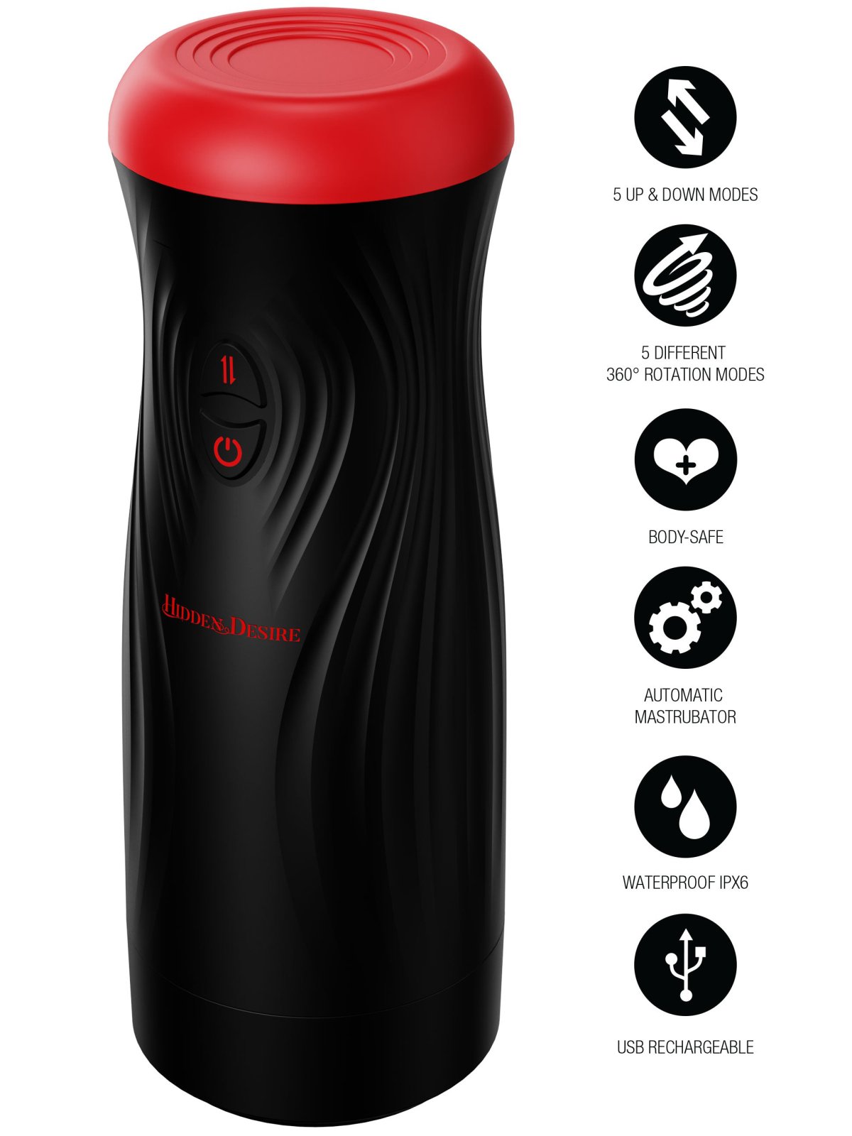 Masturbátor má rotační motor, který kombinuje přírazy a 360° rotace – díky tomu poskytne stimulaci penisu po celé jeho délce.