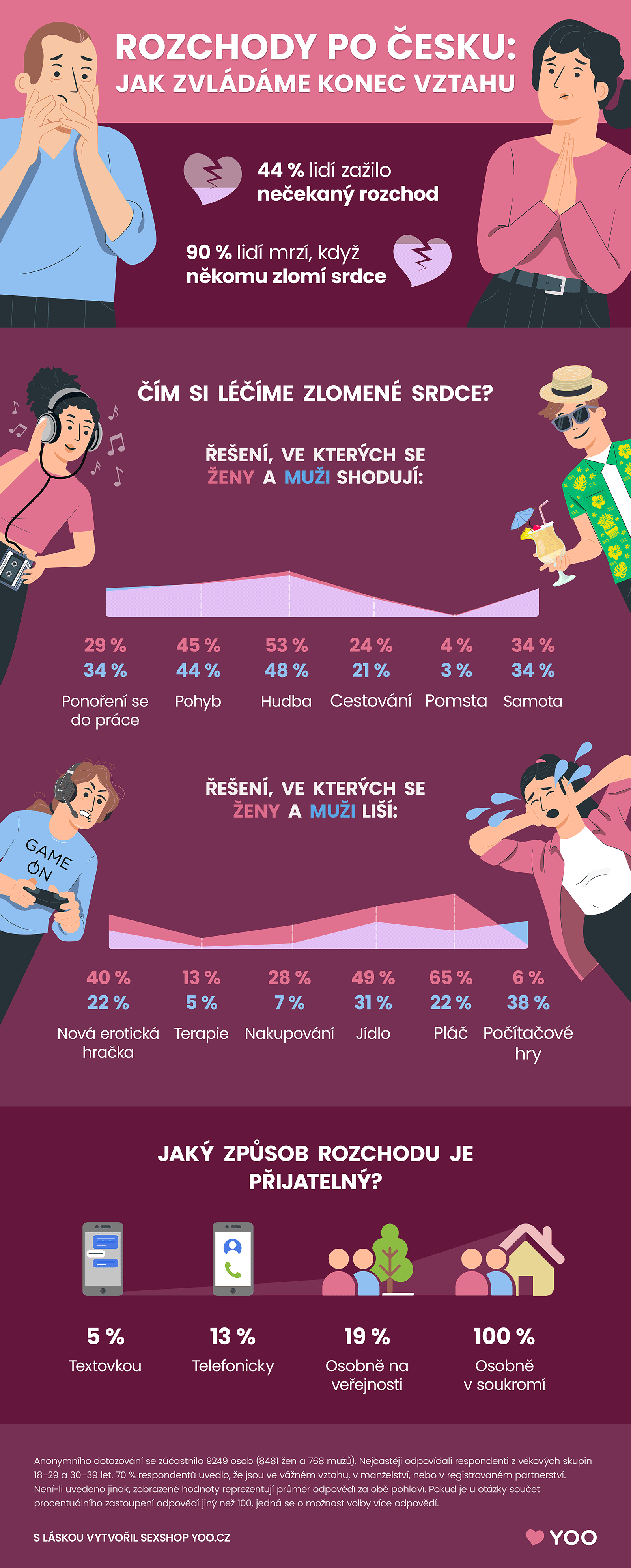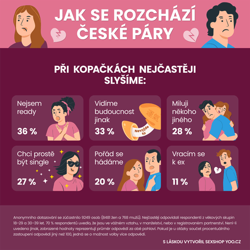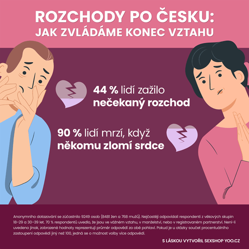 Byli jste někdy z konce vztahu smutní a měli pocit zlomeného srdce? Nebo jste se prostě nacpali čokoškou a jelo se dál? Několik tisíc lidí se s námi v průzkumu podělilo o své zkušenosti s ukončováním vztahu. Pojďte se mrknout na výsledky.
