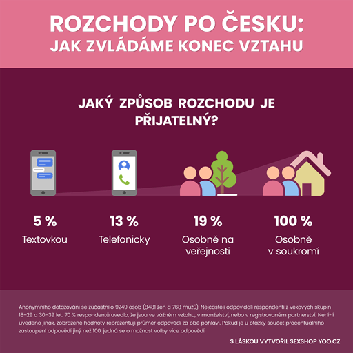 - Pouze malá část respondentů považuje za vhodný rozchod po telefonu (13 %) či formou textové zprávy (5 %)