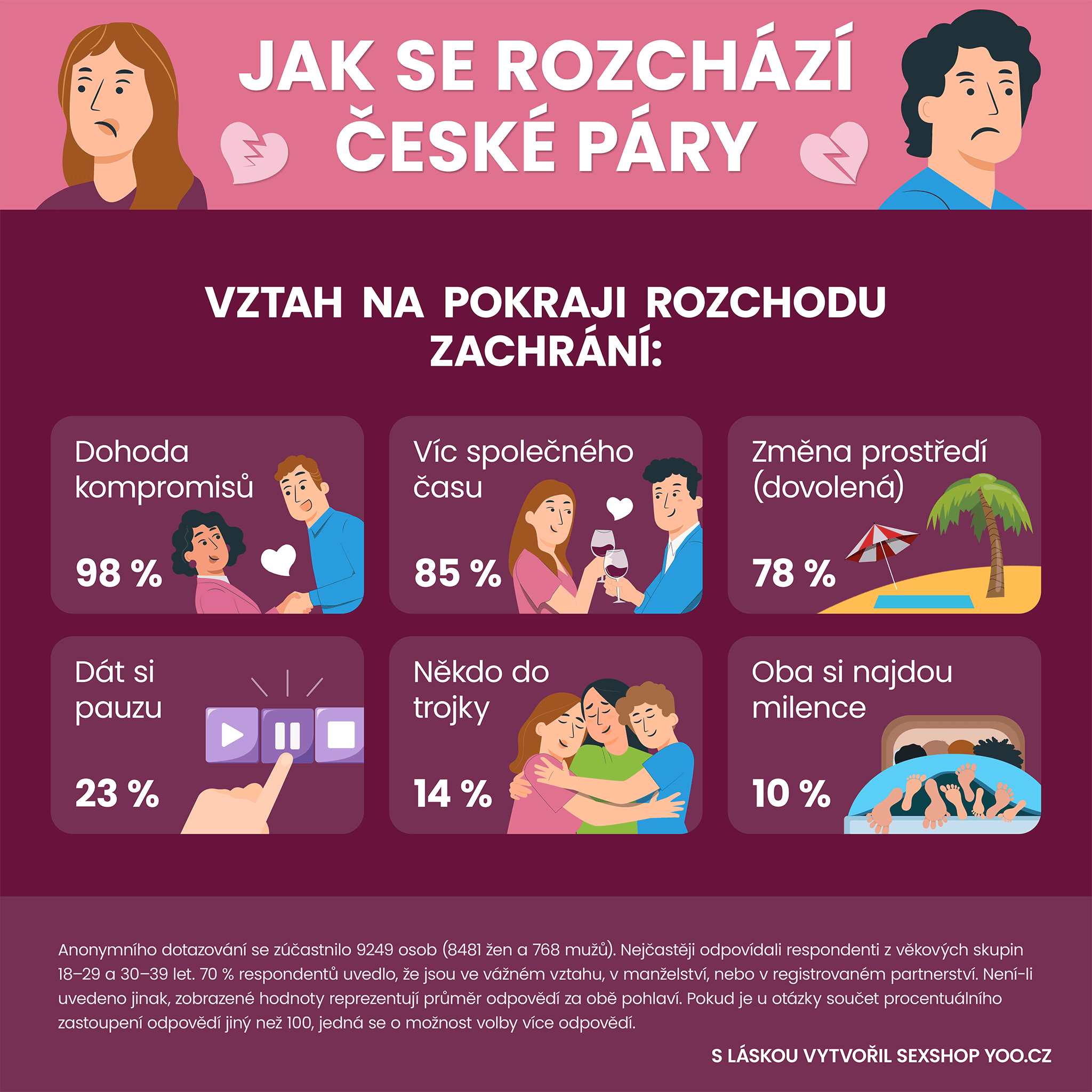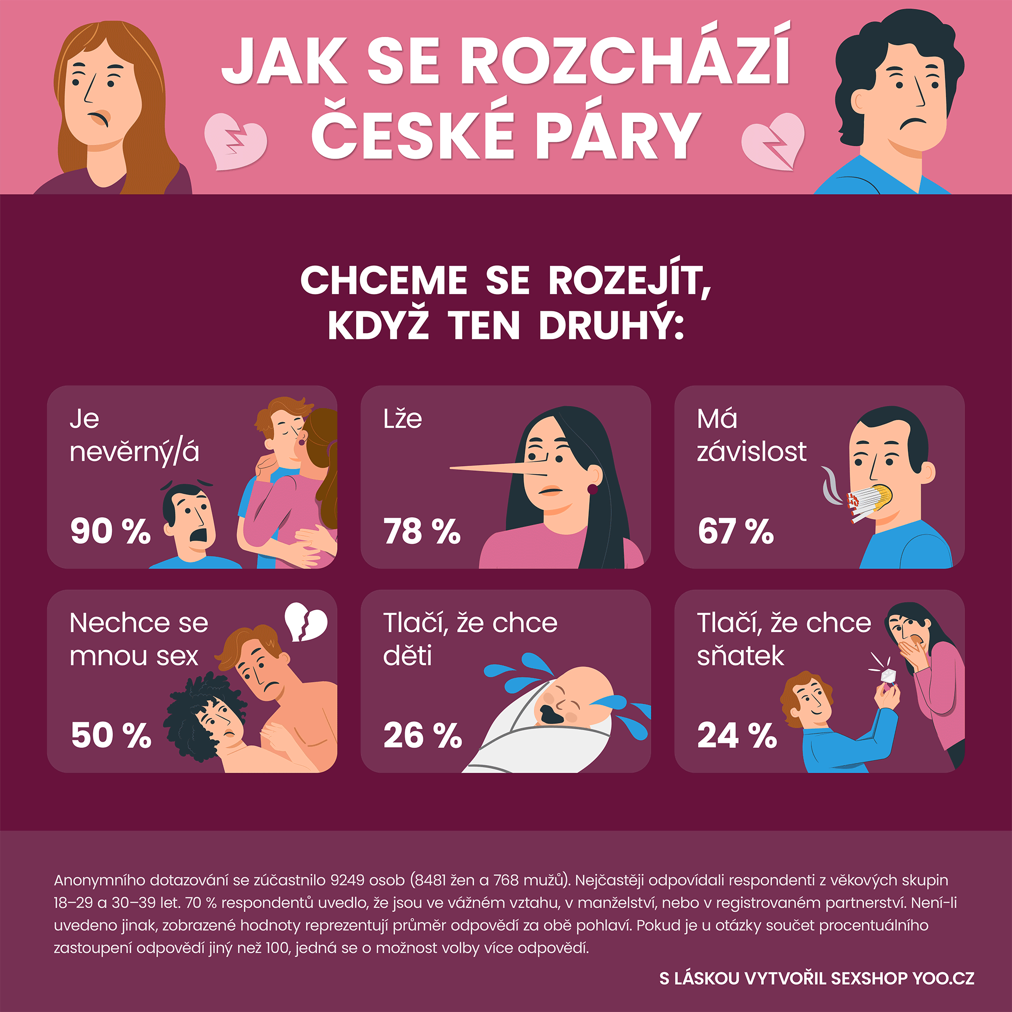 - Nejčastější důvody, proč se respondenti chtěli s protějškem rozejít: Je nevěrný/á (90 %), lže mi (78 %), má závislost – například na cigaretách, alkoholu, pornu atd. (67 %), nechce se mnou sex (50 %), tlačí na to mít děti (26 %), tlačí na uzavření manželství (24 %)