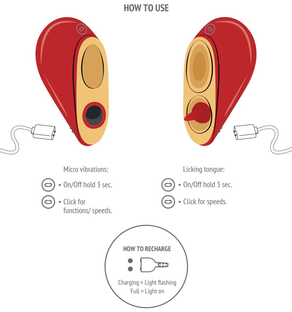 Jak se ovládá? Delším podržením příslušného tlačítka po dobu 3 sekund zapnete/vypnete pulzace nebo jazýček, krátkými stisky pak přepínáte mezi stimulačními módy.