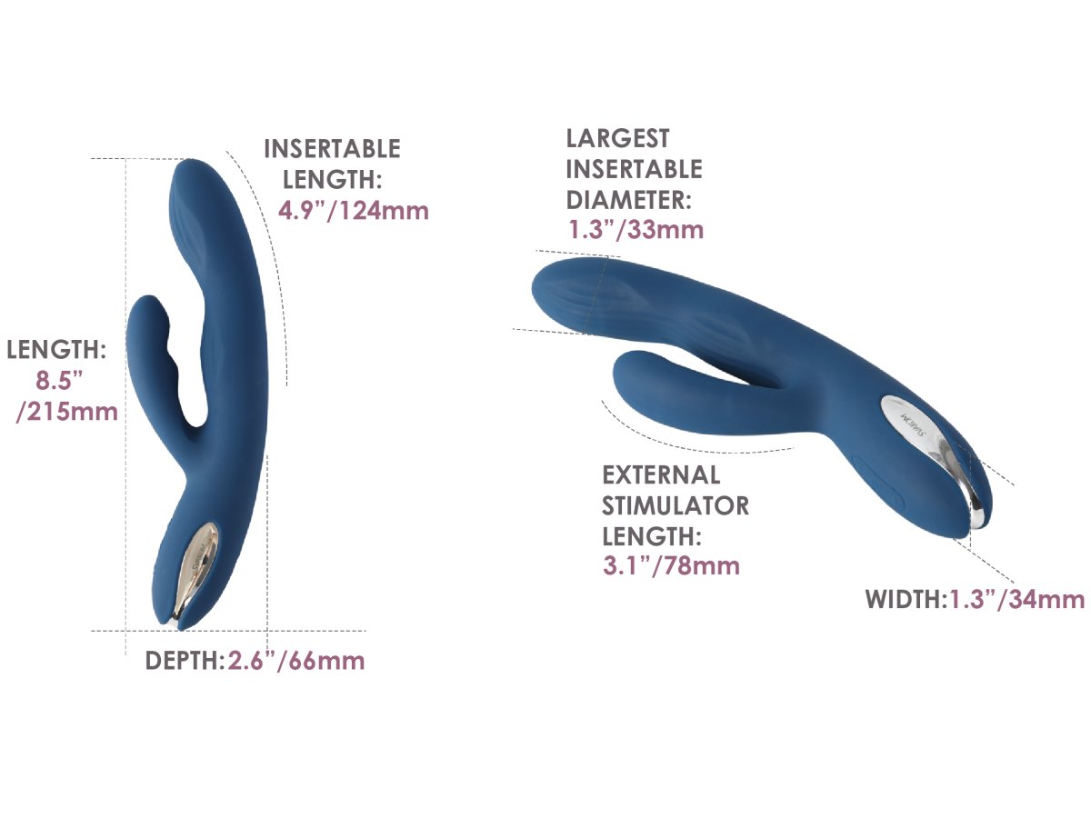 - Rozměry: celková délka 21,5 cm, zasunutelná délka cca 12,4 cm, max. průměr 3,3 cm, délka výstupku na klitoris 7,8 cm
