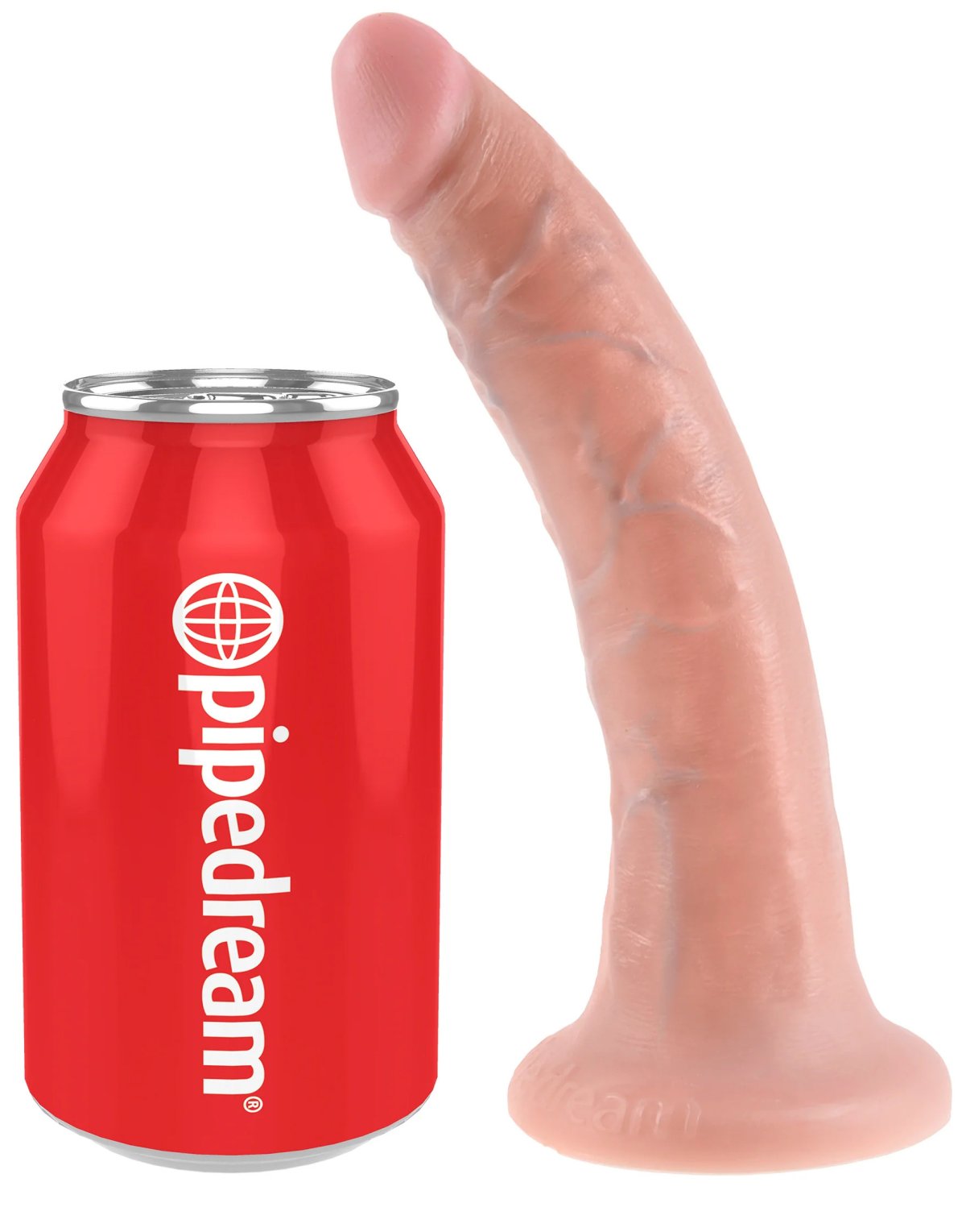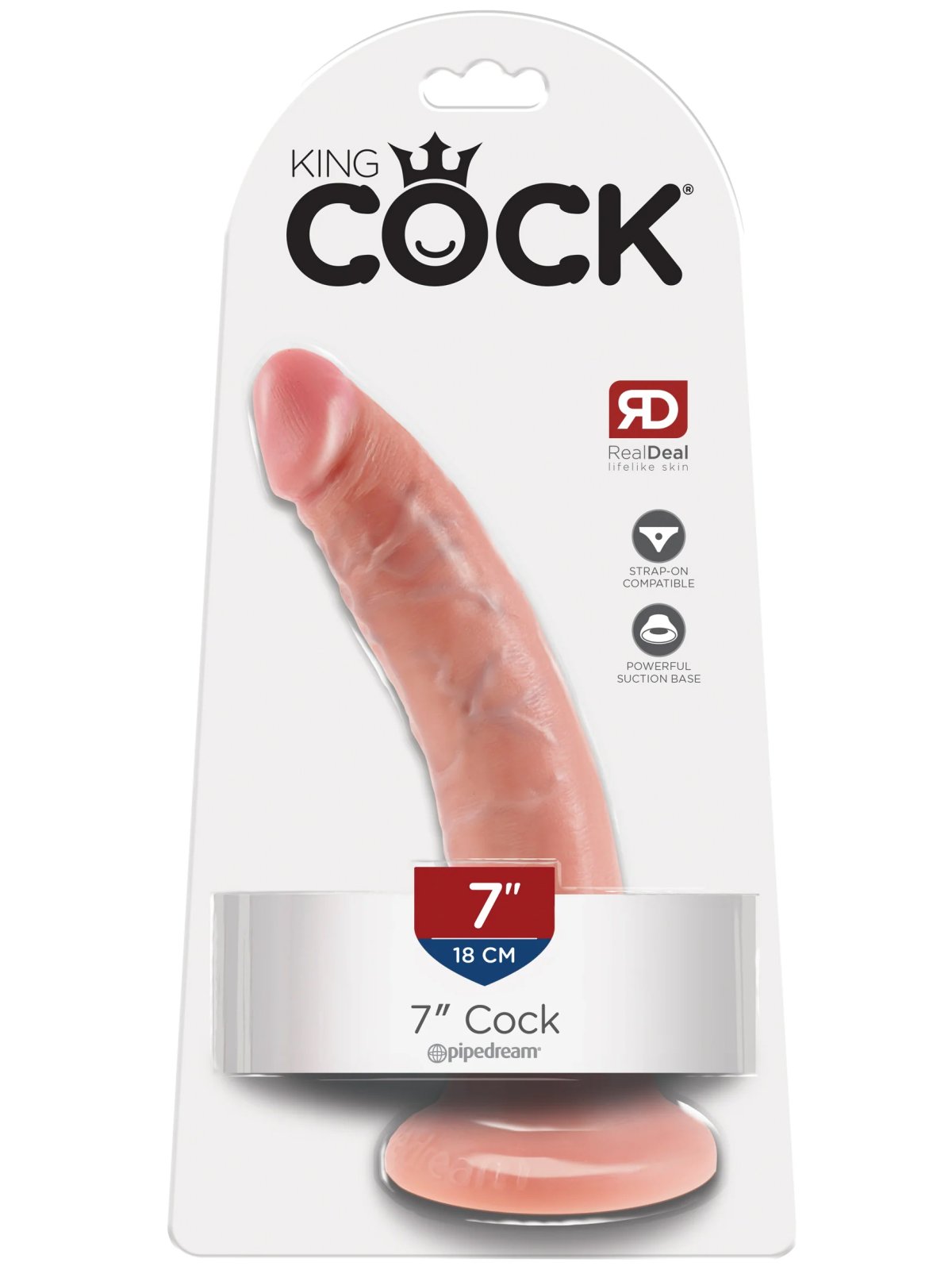Dildo King Cock 7" je mírně zahnuté pro příjemnější stimulaci bodu G či prostaty a má realisticky zpracované detaily. Silná přísavka funguje i jako anální zarážka.