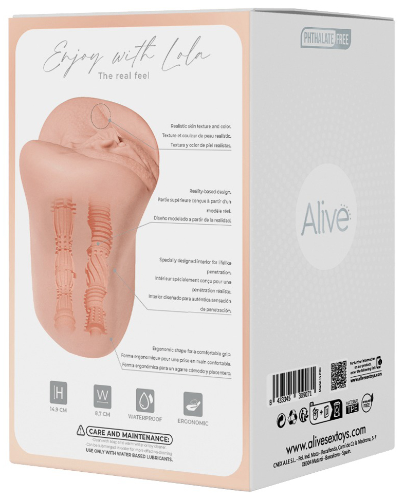 Masturbátor Lola má 2 realisticky vymodelované otvory – vaginu a zadeček. Tunýlky jsou těsné a nabízejí rozmanitou stimulační texturu pro maximum potěšení.