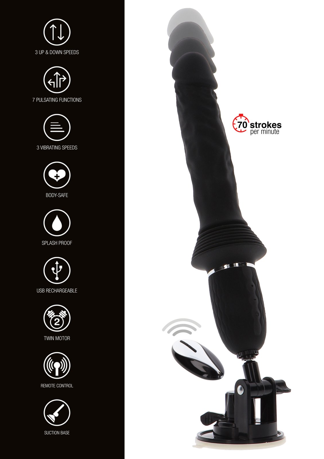 Vibrátor zvládne 70 přírazů za minutu v rozsahu 8 cm a celkem si můžete vybrat ze 3 rychlostí přirážení a 10 různých vibračních módů. Přírazy i vibrace ovládáte samostatnými tlačítky.