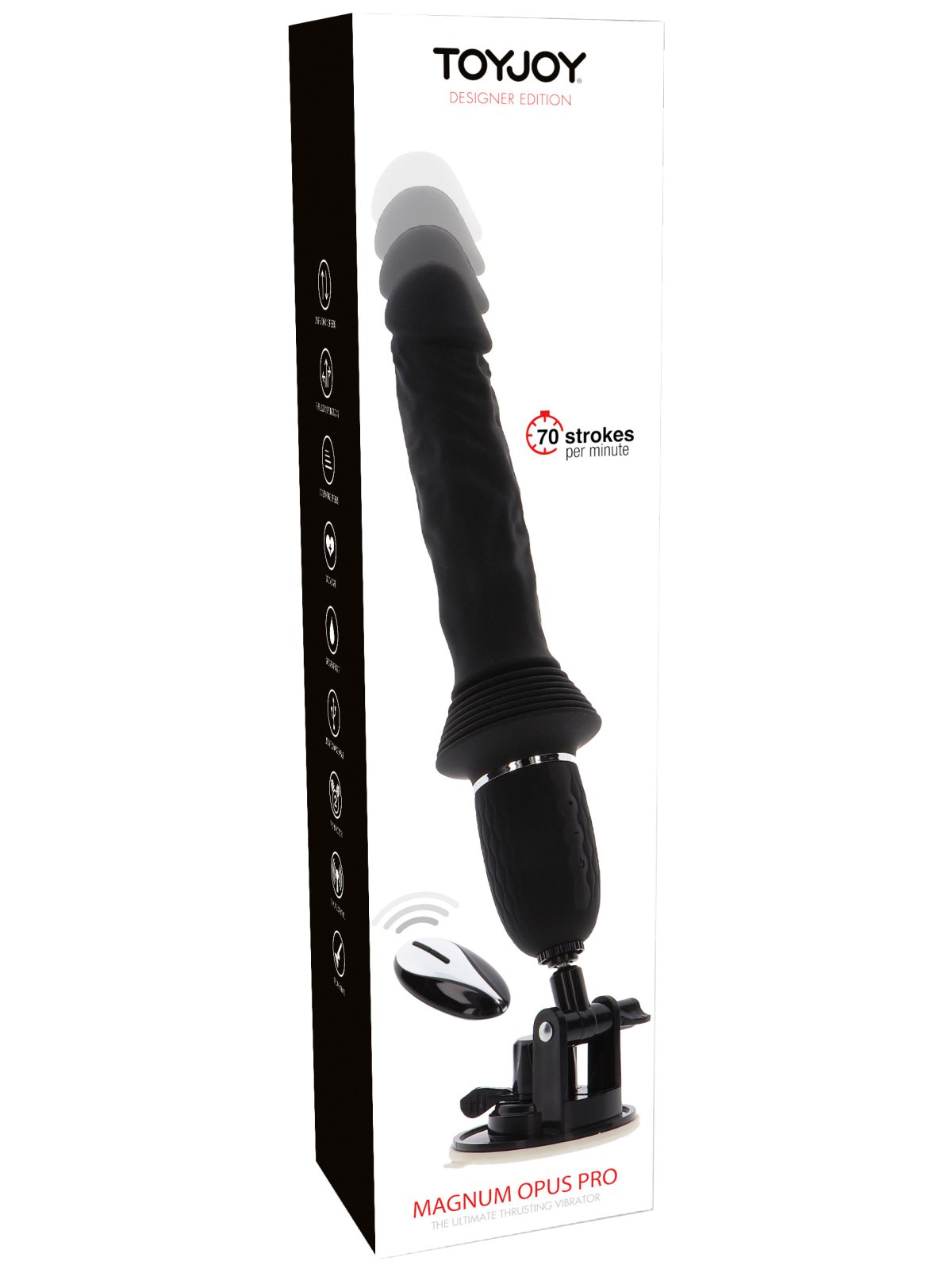 Vibrátor Magnum Opus Pro má hluboké a intenzivní přírazy a silné vibrace. Díky přísavce a dálkovému ovladači se snadno používá.