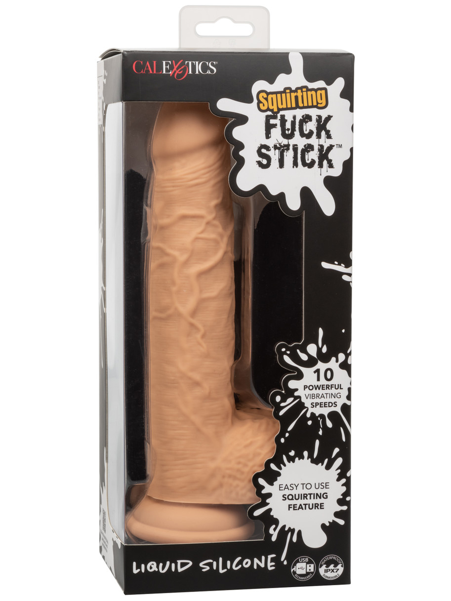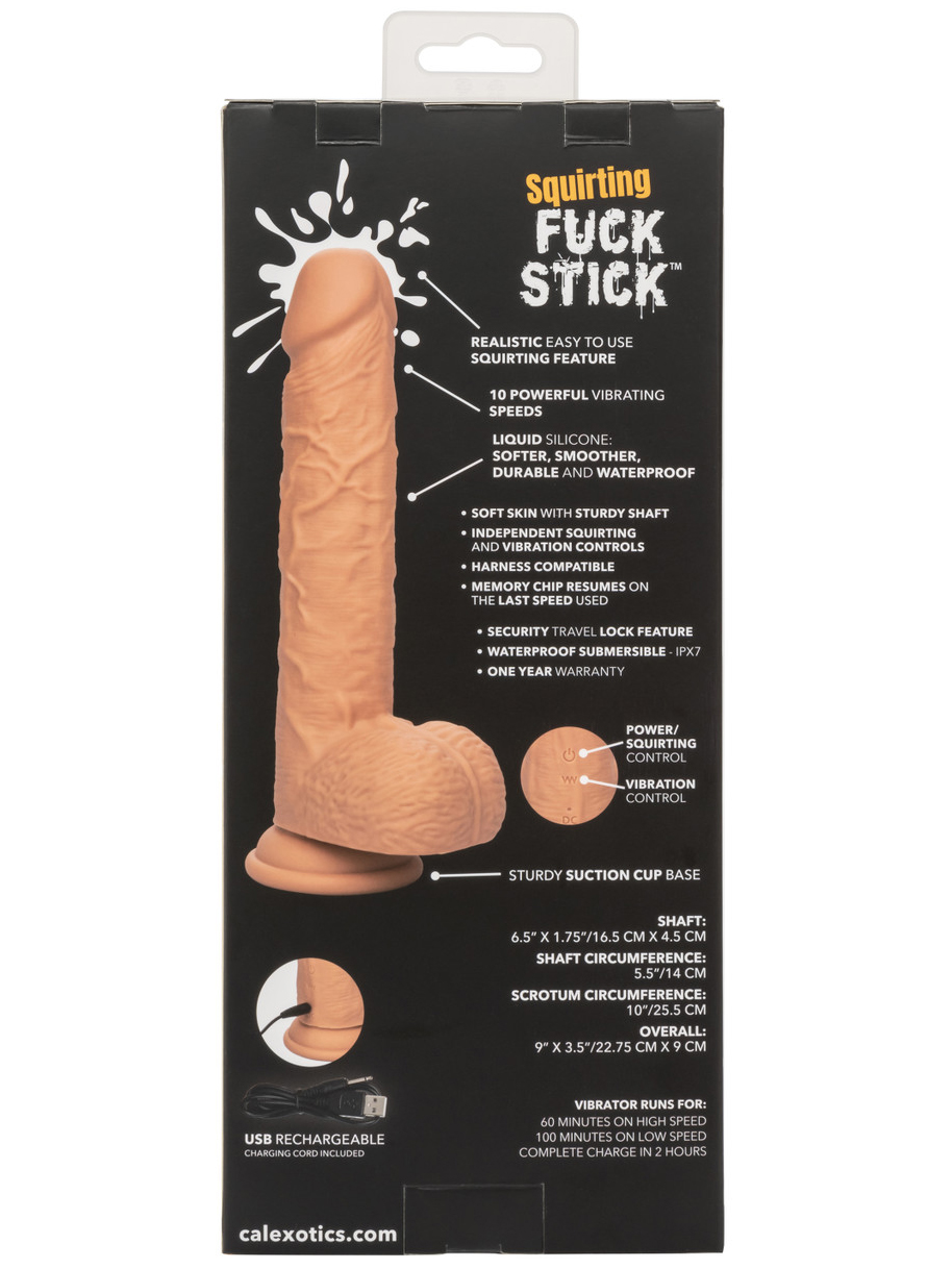 Vibrátor Squirting Fuck Stick stříká na povel – stačí zmáčknout tlačítko. Má silnou přísavku, která se přicucne k prakticky jakémukoliv čistému a hladkému povrchu.