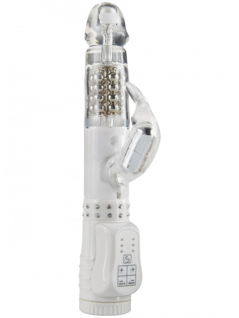 Vibrátor je vyrobený z kombinace bílého plastu a transparentního měkkoučkého gelu. Navíc je dozdobený dvěma řadami třpytivých kamínků, které najdete nad ovládací částí. Špička vibrátoru nevibruje, ale rotuje a má čtyři řady pohyblivých perel - připravte se na skutečně intenzivní masáž poševních stěn a dráždění bodu G.