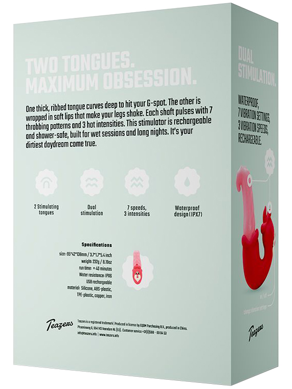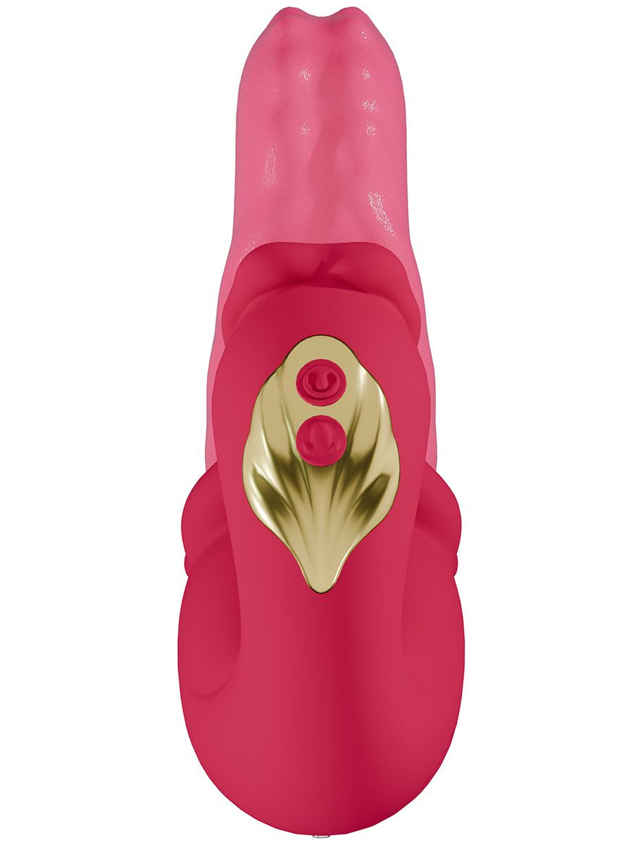 Oba motorky ovládáte samostatnými tlačítky pro snadné přizpůsobení stimulace. Velký jazyk má ohebnou špičku pro větší pohodlí během hraní a žebrovaný povrch pro extra potěšení.