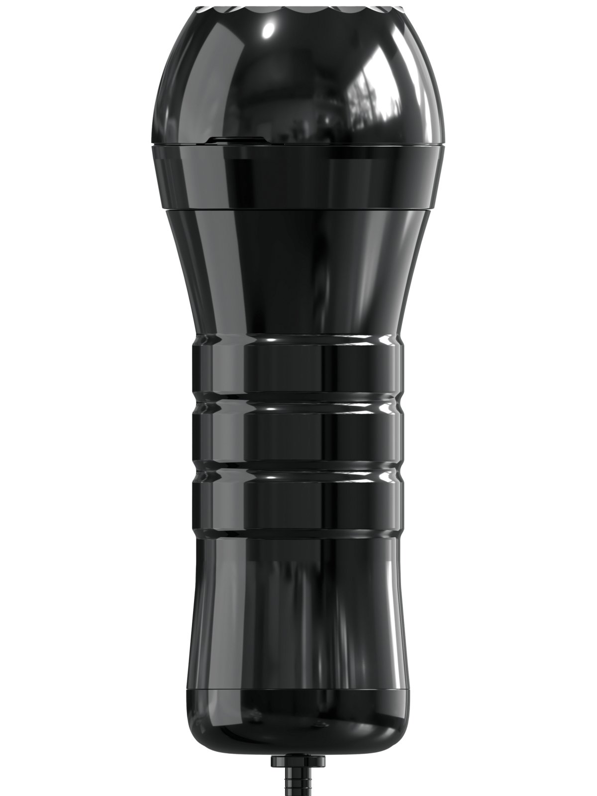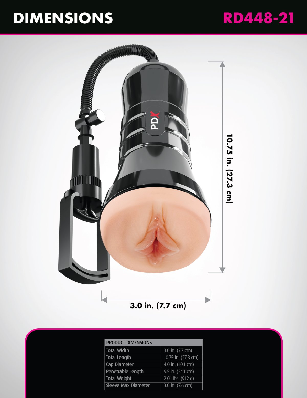 Vagina má samolubrikační efekt a dostanete k ní 2 spodní uzávěry. Jeden slouží pro klasickou regulaci podtlaku, druhý pro připojení hadičky s pístem pro vytvoření extra silného sání.