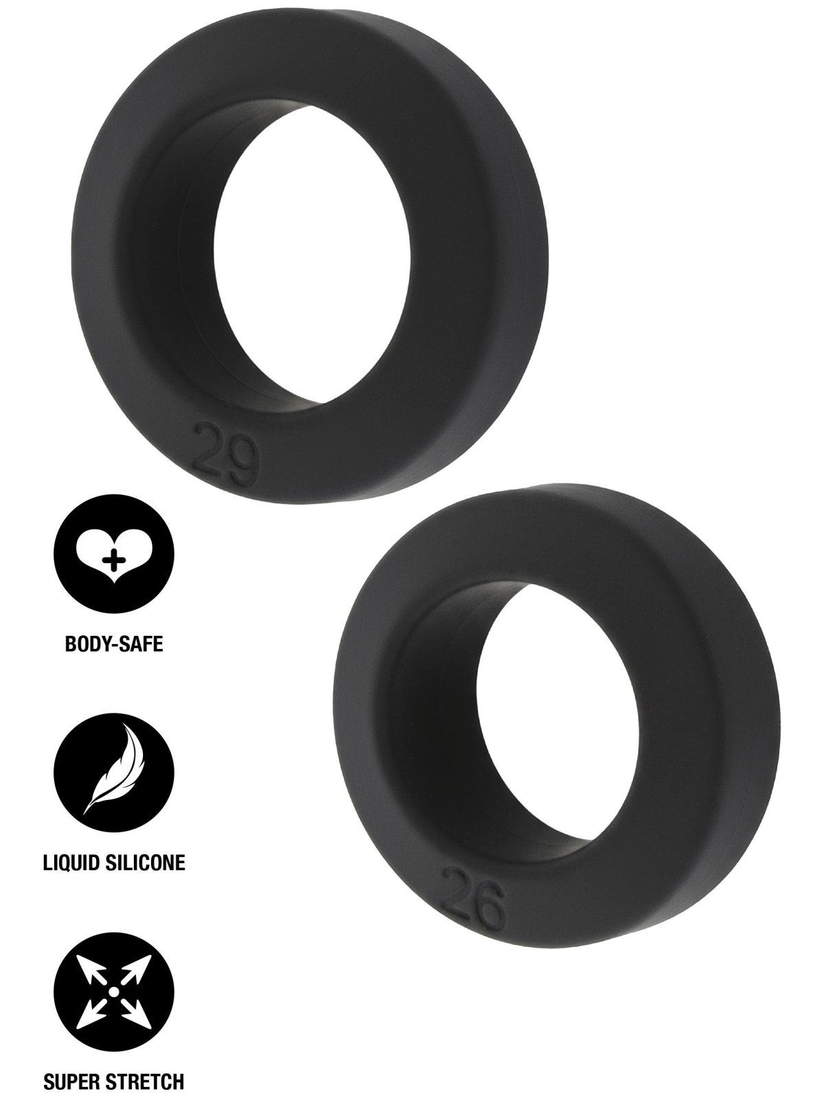 Sada obsahuje 2 kroužky o různých průměrech, které můžete libovolně kombinovat podle potřeby – pro stažení samotného penisu i penisu s varlaty.