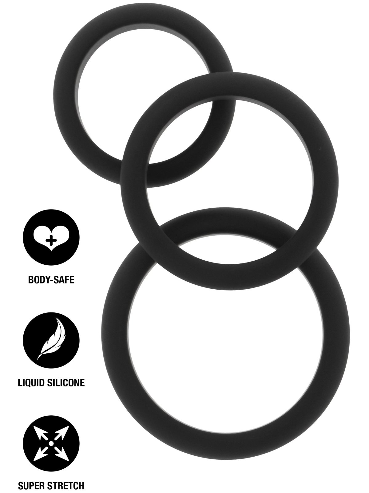 Sada obsahuje 3 kroužky o různých průměrech, které můžete libovolně kombinovat podle potřeby – pro stažení samotného penisu i penisu s varlaty.