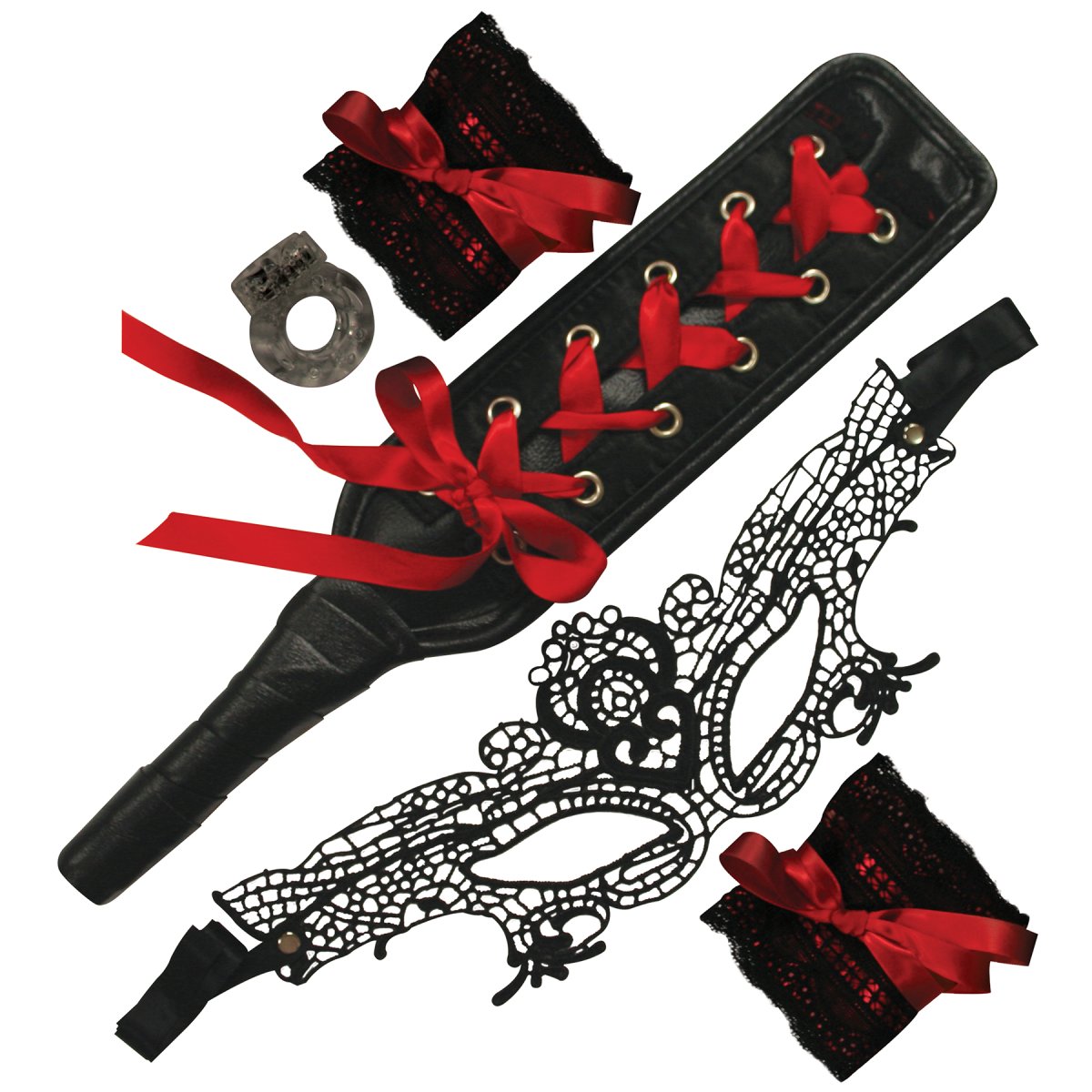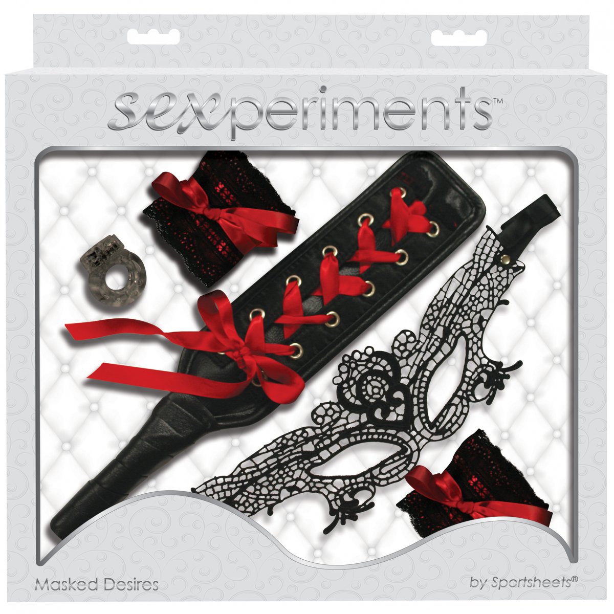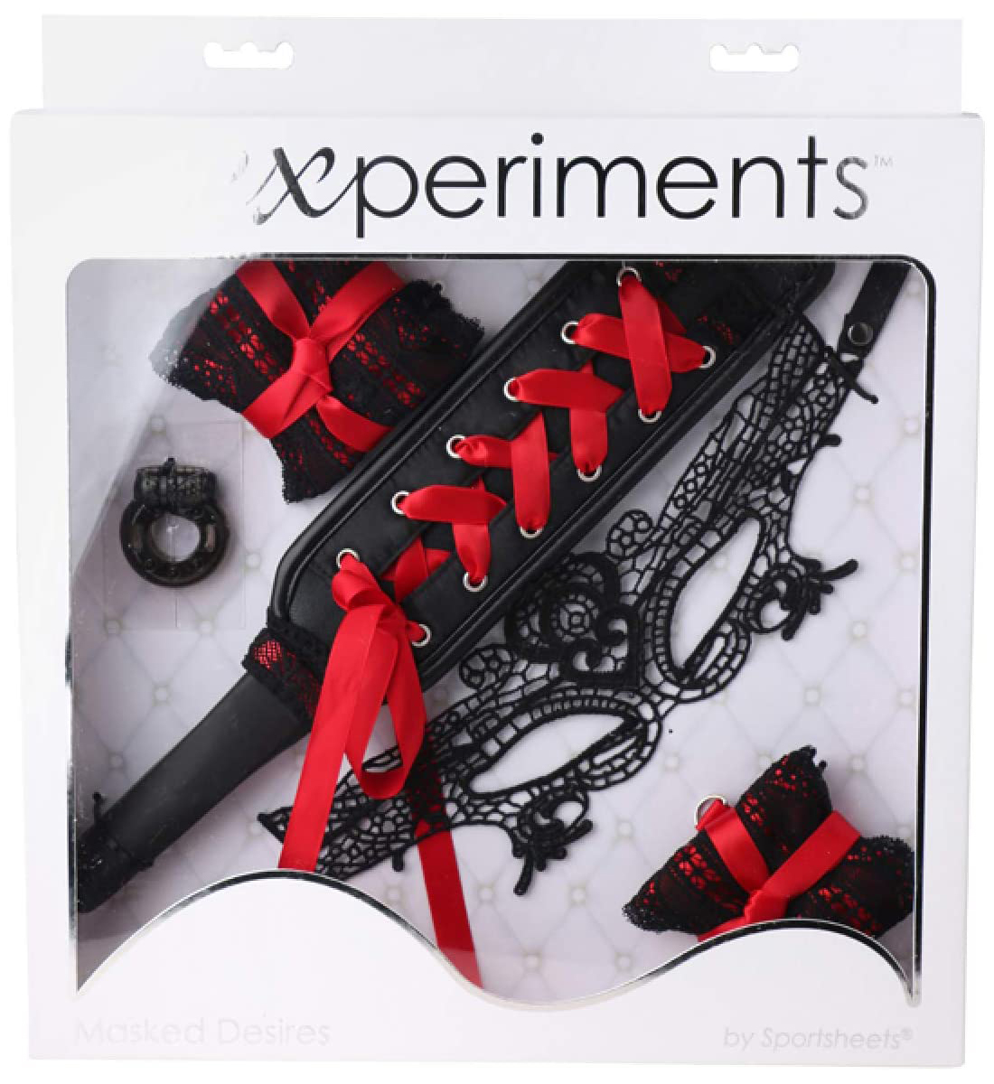 S krásnou sadou erotických pomůcek Masked Desires od Sexperiments prožijete spoustu sexuálních fantazií. Celá sada se nese na vlně krajky a vzrušující červené barvy a obsahuje škrabošku, pouta, plácačku a vibrační kroužek. Provede vás tedy především začátky BDSM a bondage.