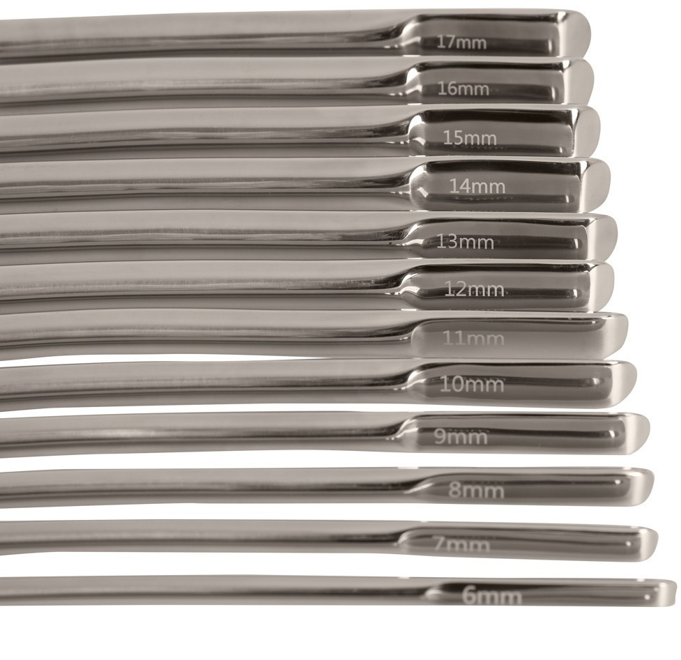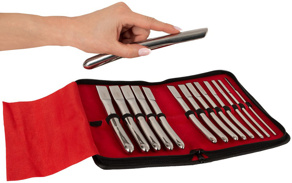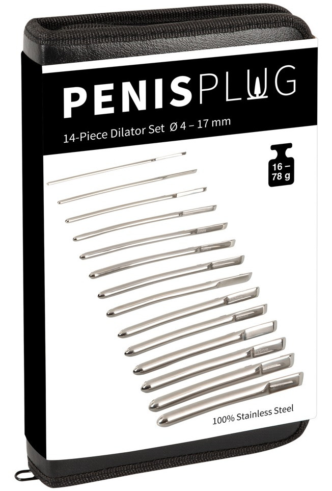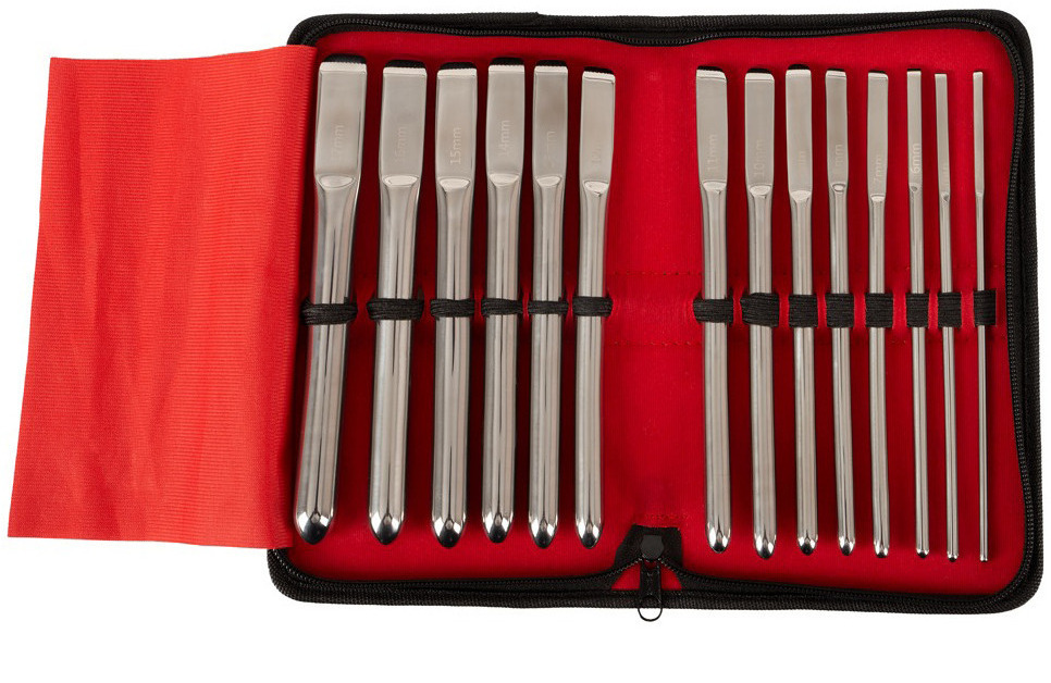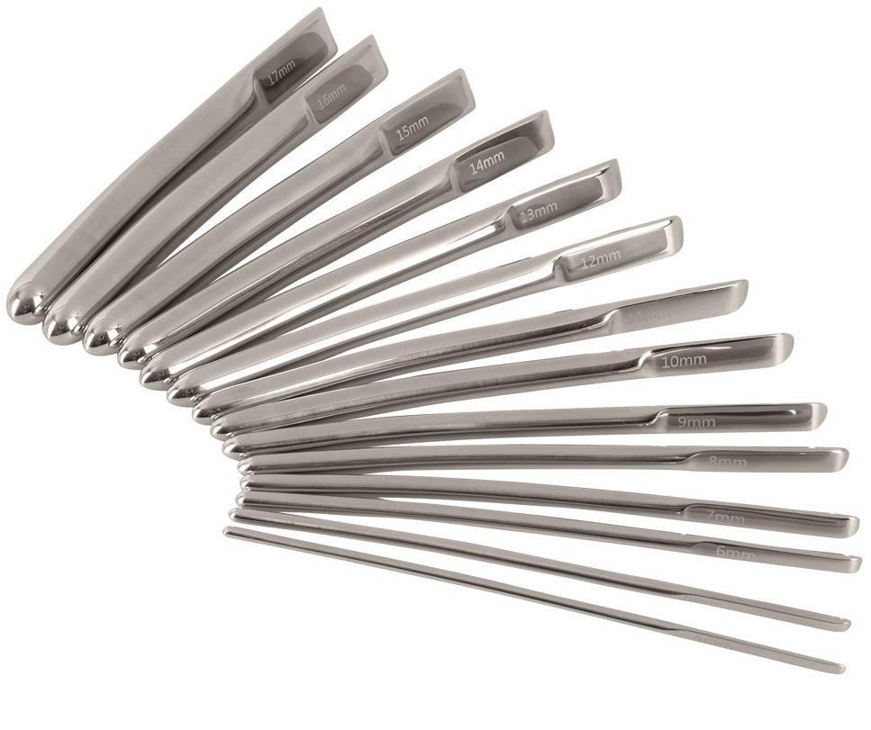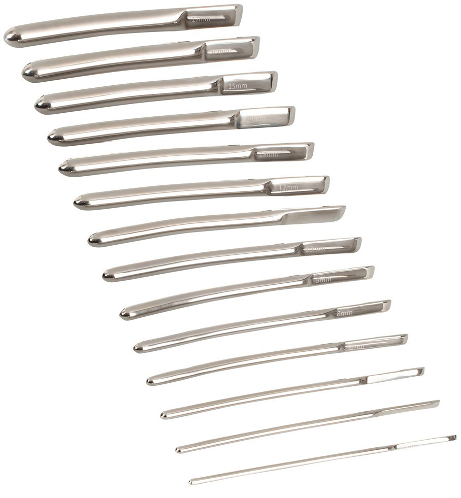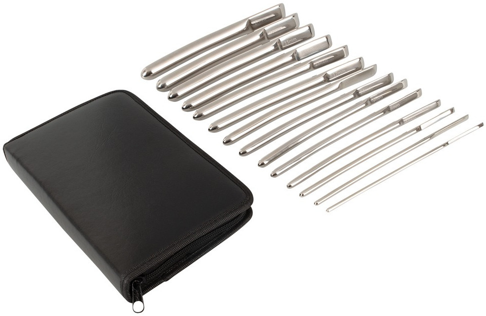V sadě najdete 14 dilatátorů o různém průměru, které poslouží pro postupné roztahování a stimulaci močové trubice. Na každém dilatátoru je vyryt jeho průměr.