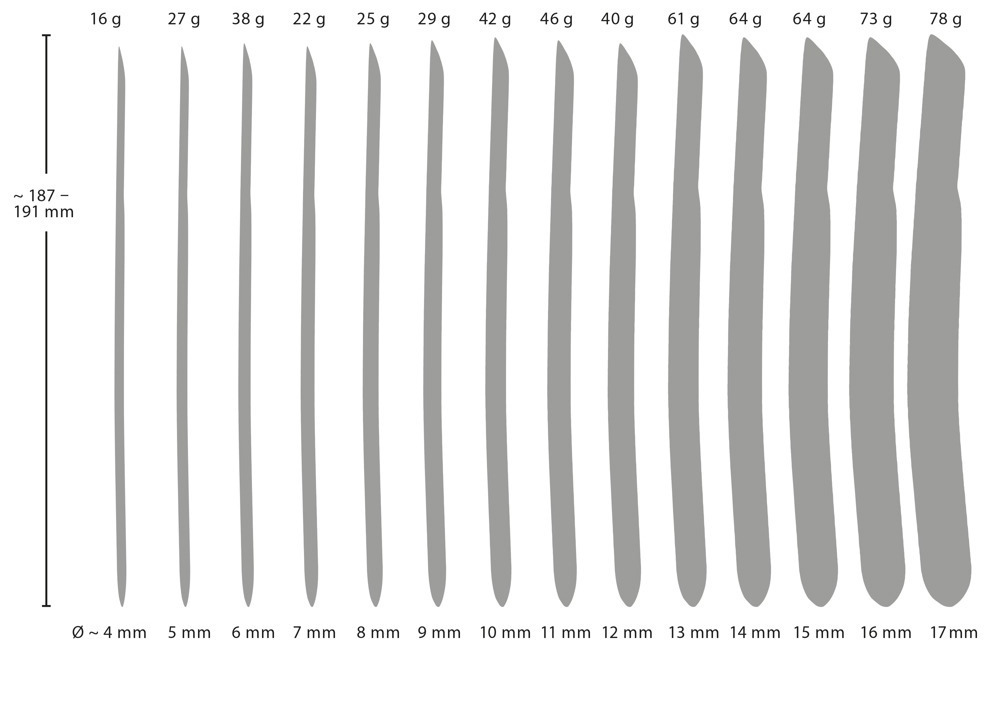- Rozměry: celková délka 18,7 – 19,1 cm, průměr 4 – 17 mm