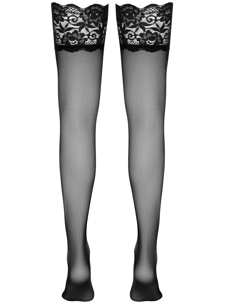 Punčochy jsou ušity z měkké a elastické průsvitné látky. Mají široký krajkový lem se silikonovými pásky, díky kterým drží na nohách i bez použití podvazkového pásu.