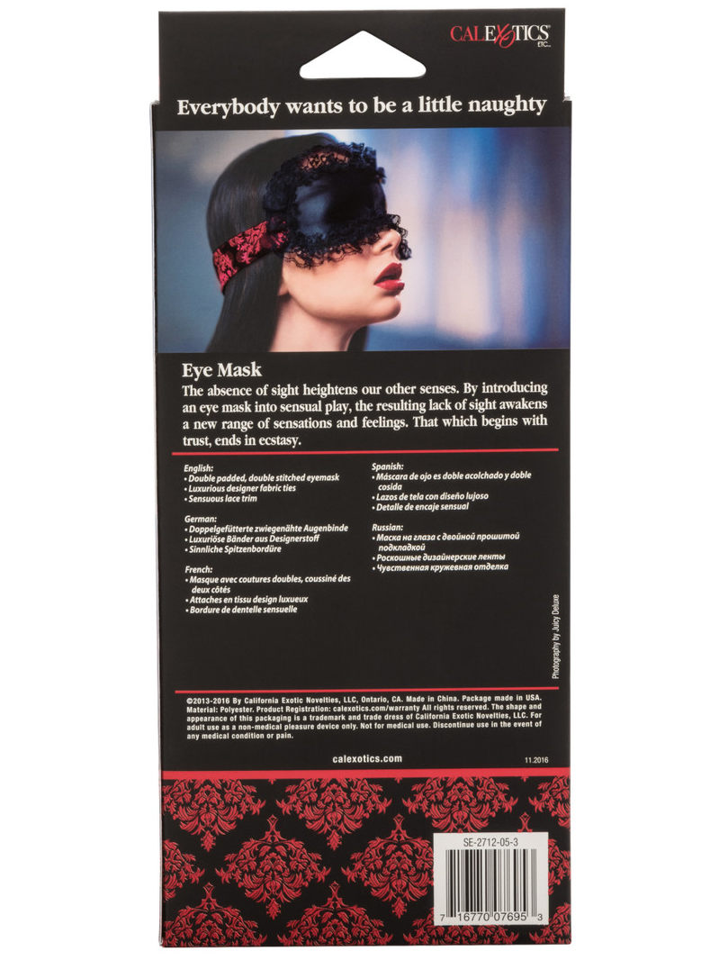 Maska je dostatečně dlouhá i široká, aby nepropustila jediný paprsek světla. Její okraj zdobí elegantní černá krajka.