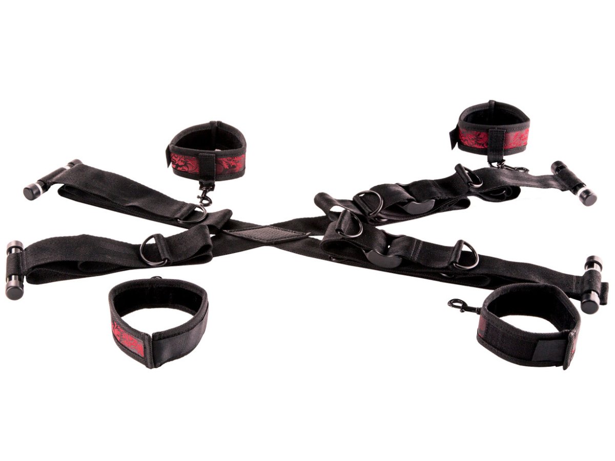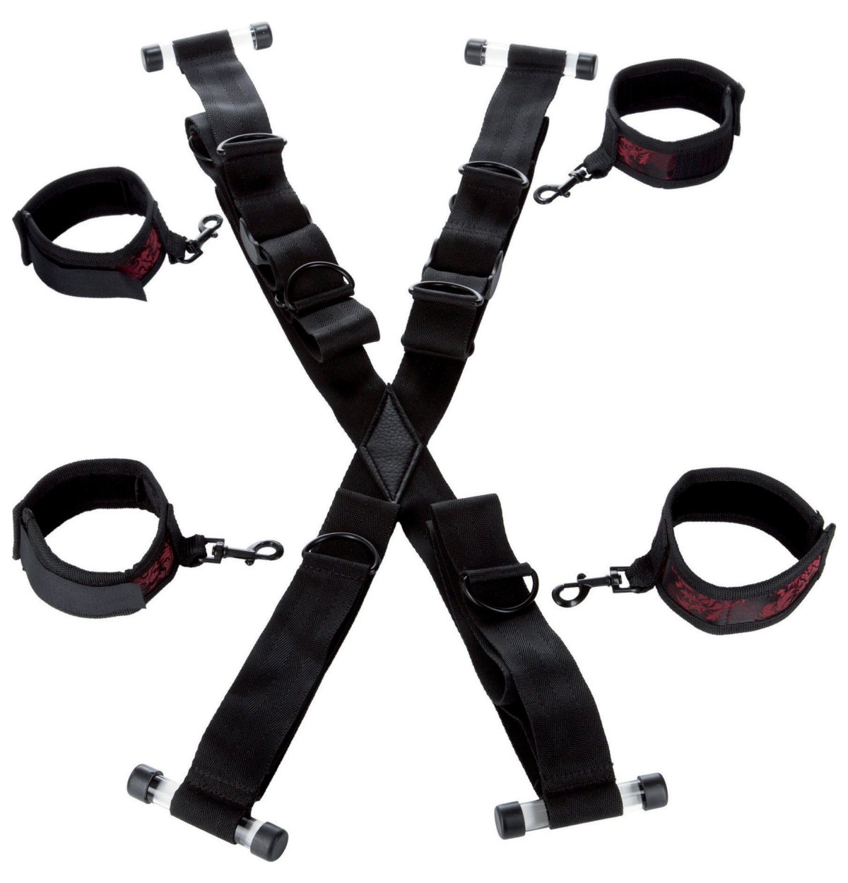 Poutací kříž se skládá z popruhů a 2 párů pout (na ruce a nohy). Popruhy jsou délkově nastavitelné, takže se snadno přizpůsobí rozměrům všech dveří.