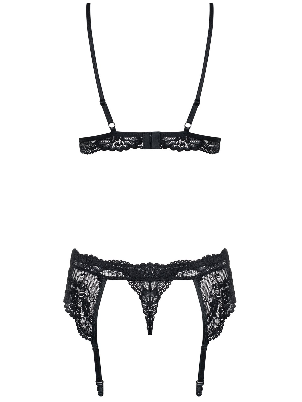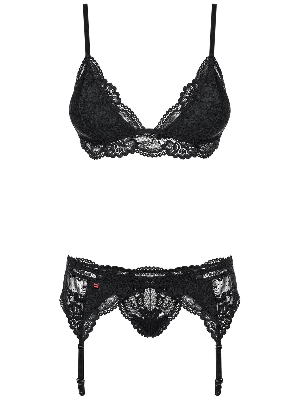 Set se skládá z podprsenky, tang a podvazkového pásu. Vše je ušito z měkké a elastické krajky, která se pohodlně nosí.
