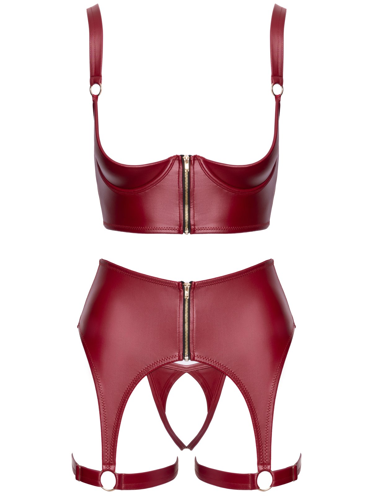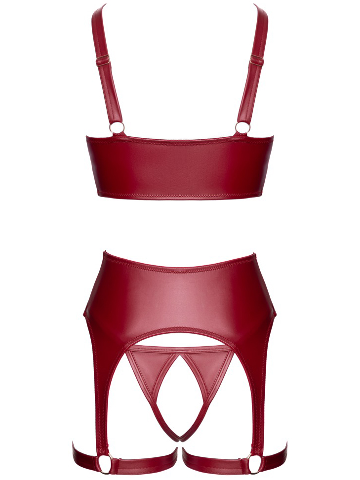 Set se skládá z podprsenky, tang a podvazkového pásu. Vše je ušito z matně lesklé látky, která je měkká a elastická a pohodlná i při delším nošení.