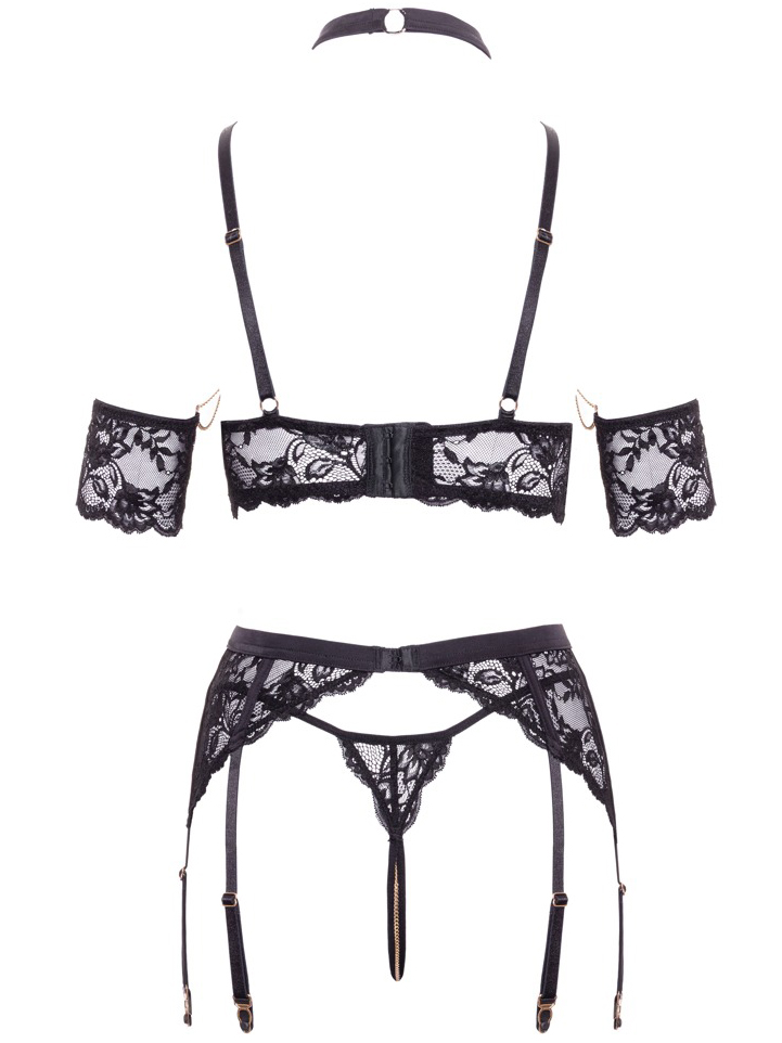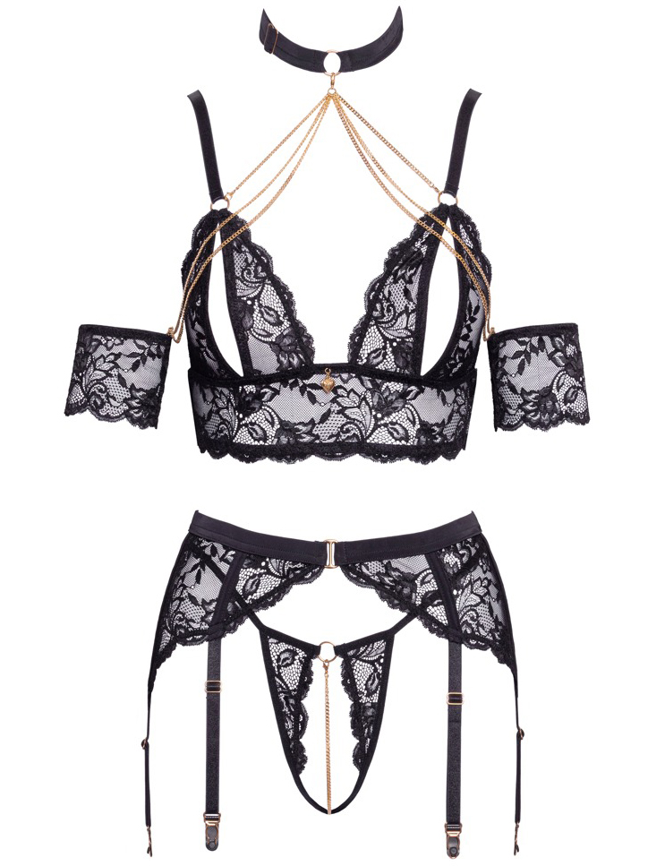 Set obsahuje podprsenkový top, podvazkový pás, tanga a ozdobný obojek. Vše je ušito z měkké a elastické krajky, která se pohodlně nosí.