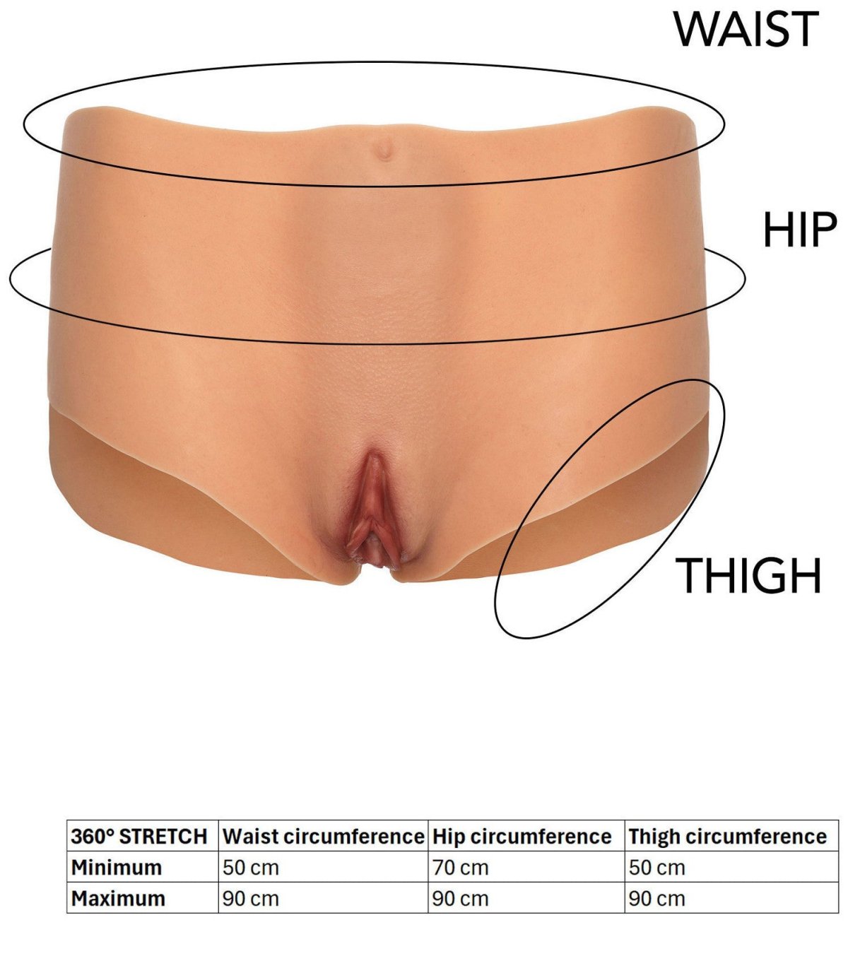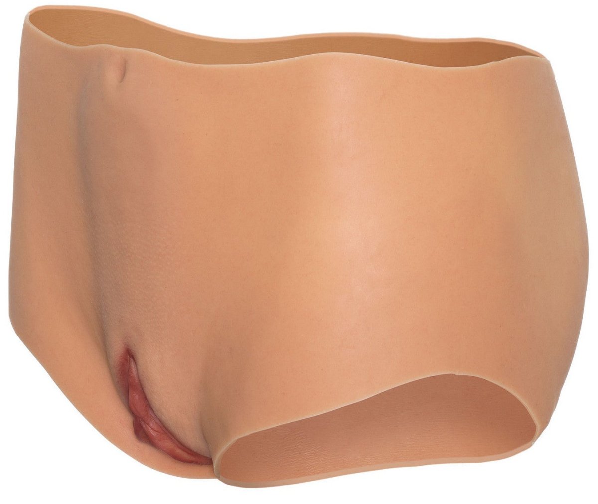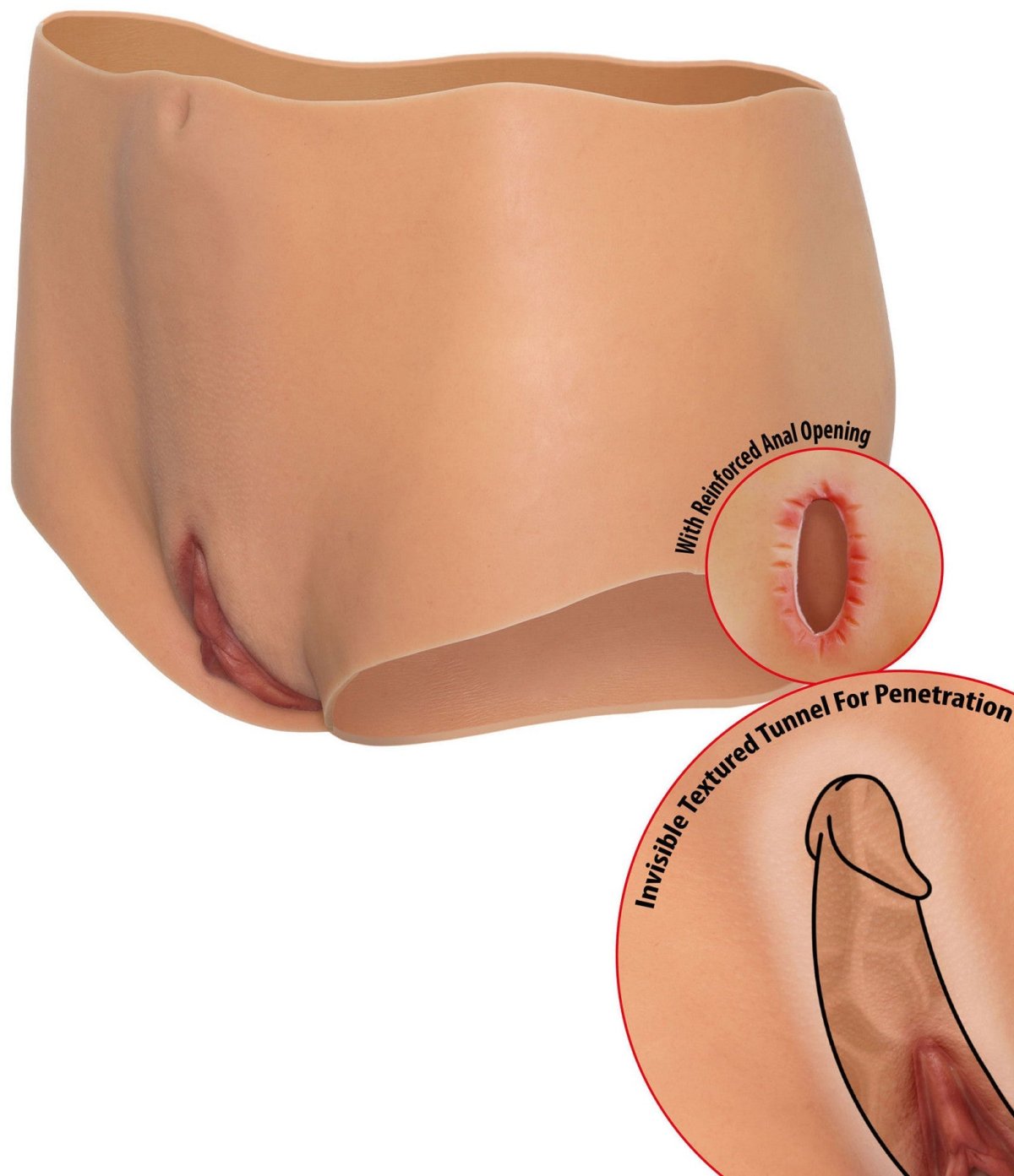 Kalhotky mají realisticky vymodelovanou vaginu se skrytým tunelem pro sex a otvor na zadní straně umožňující anální penetraci.