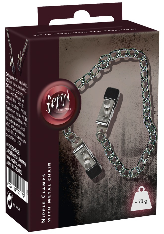 Svorky spojuje těžší kovový řetízek, který se bude během nošení pohupovat a tím bude vaše bradavky ještě více stimulovat. Trýznivějšího zážitku dosáhnete, když na řetízek zavěsíte závaží, nebo pokud vás za něj miláček zatahá.