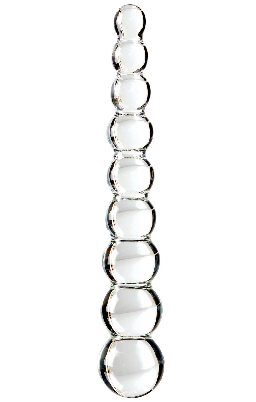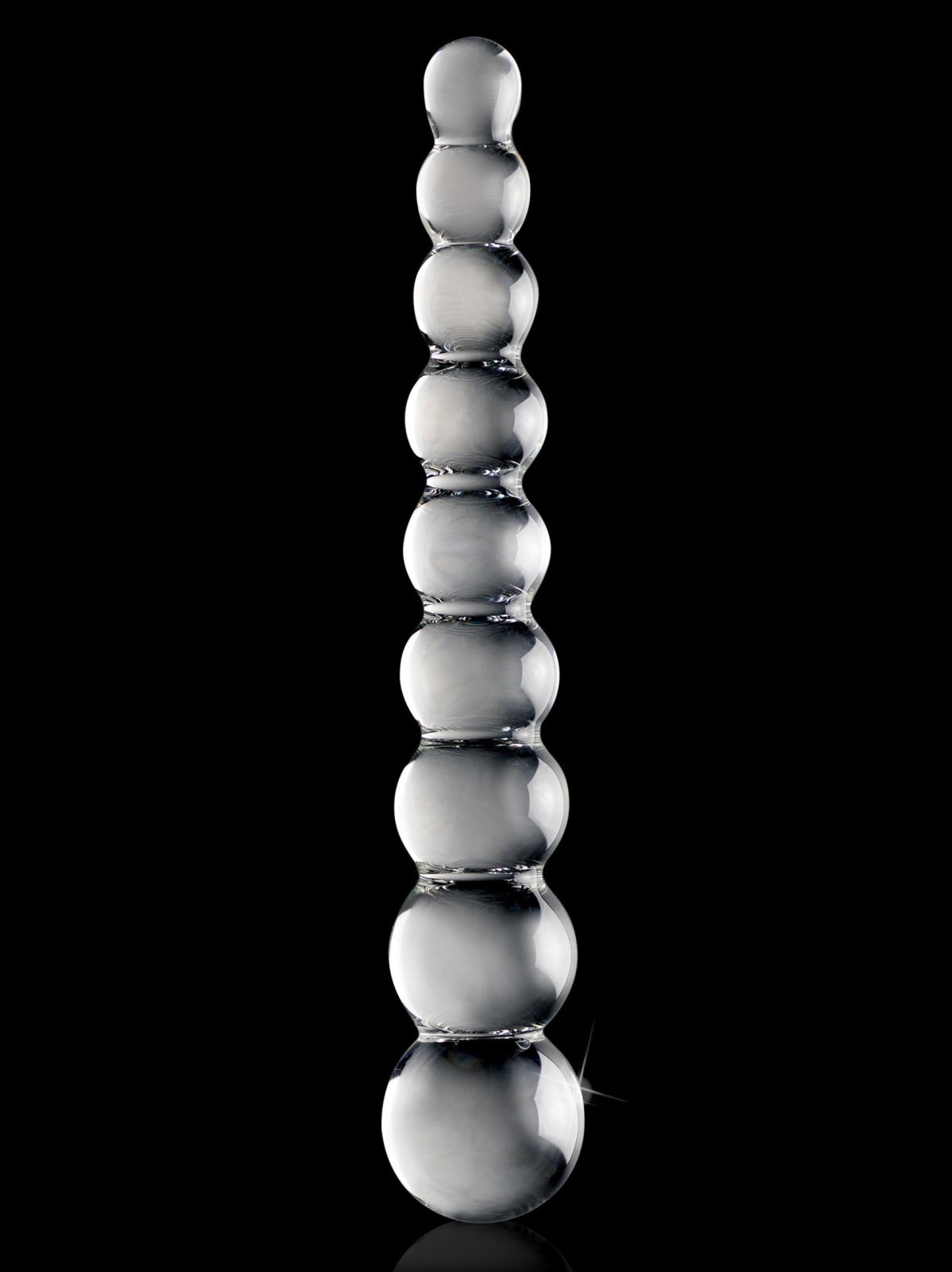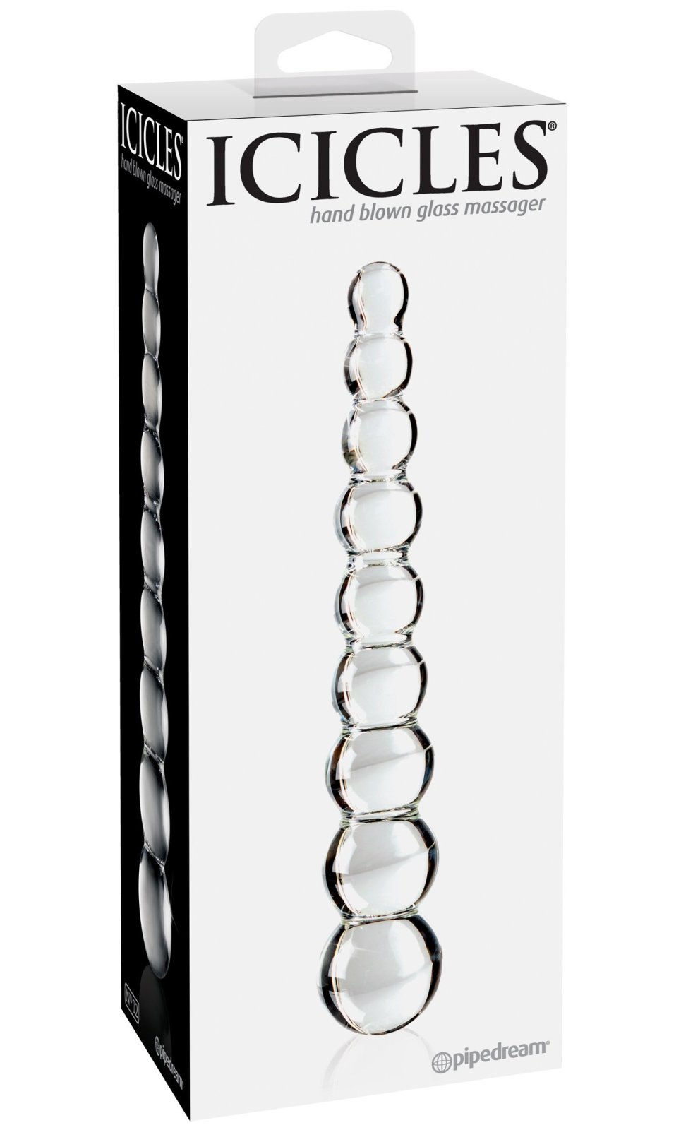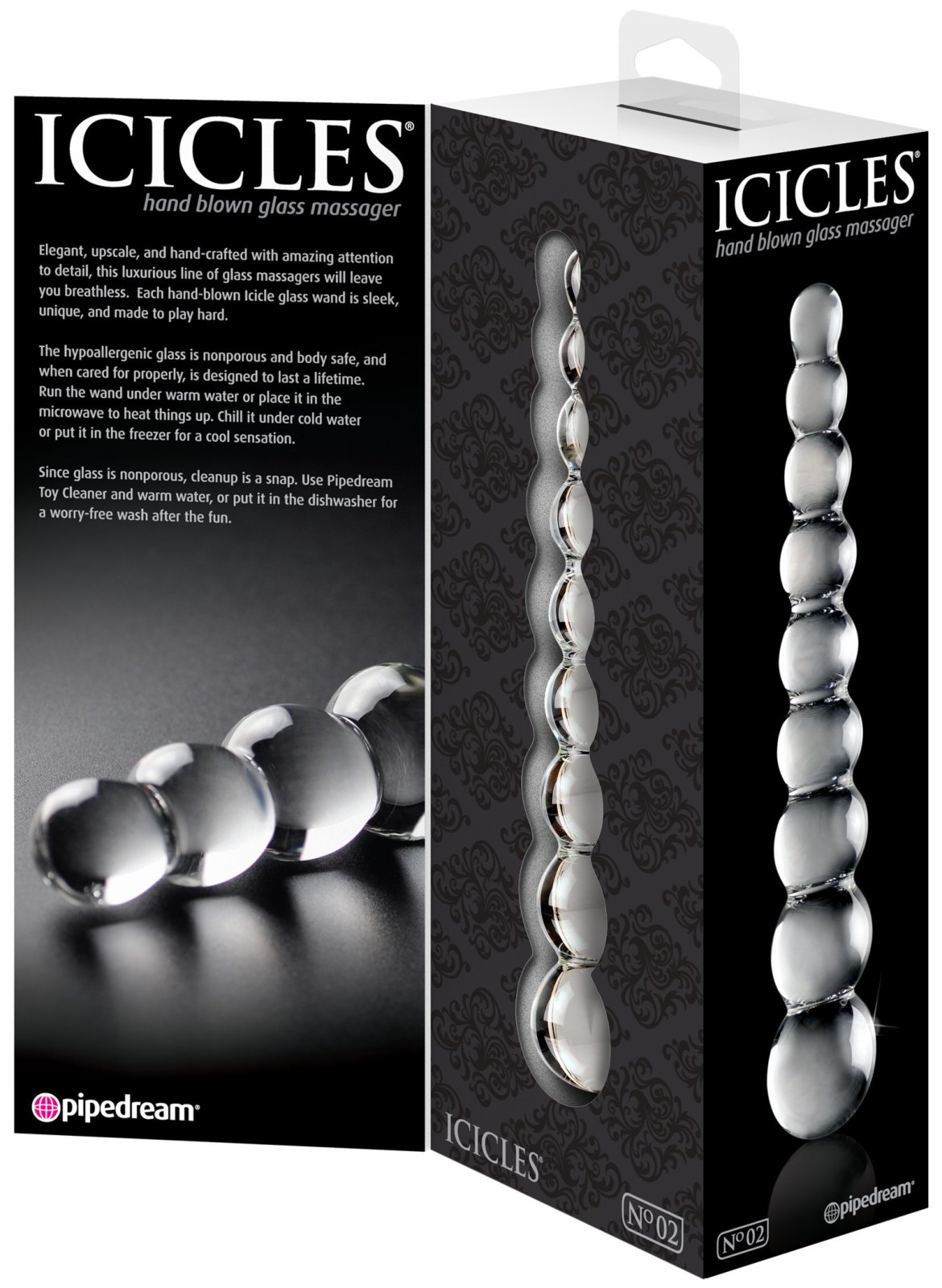 Skleněné dildo Icicles No. 2 s výraznými přechody mezi kuličkami je jako dělané pro intenzivní hrátky s vaginou či zadečkem.